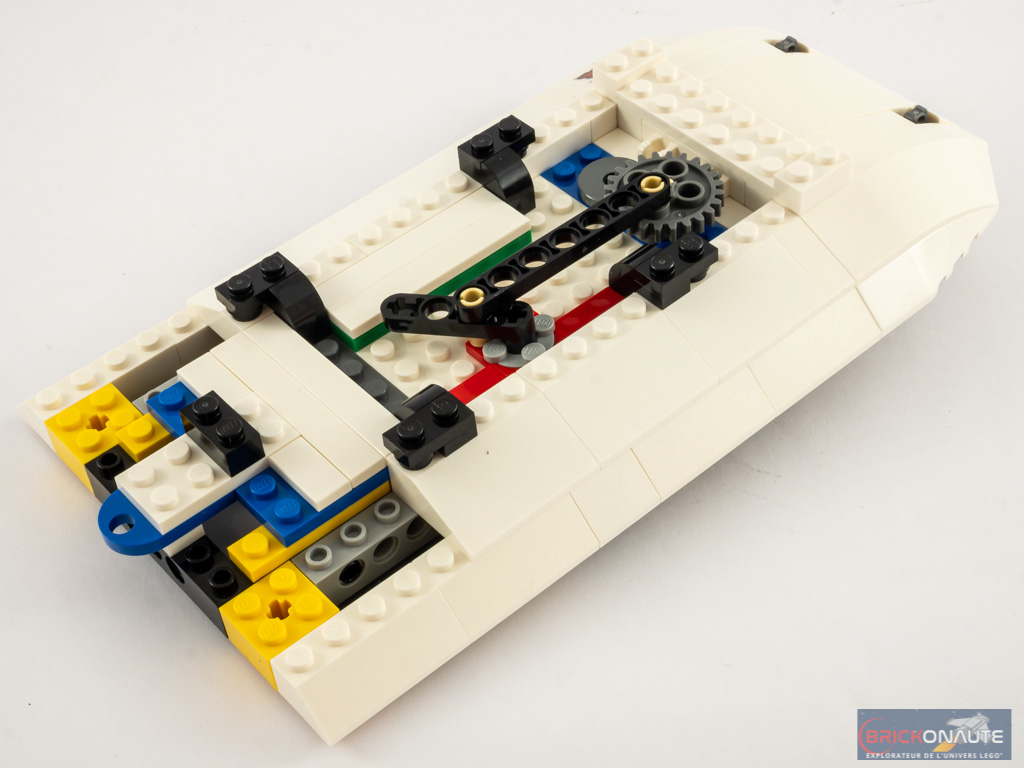 Si le design est réussi, c’est également le cas des différentes fonctionnalités, et il y en a beaucoup. Les portières et le coffre s’ouvrent, avec pour les portières avant une double charnière déjà vue dans le set 10265 Ford Mustang (réalisé par le même designer LEGO, Mike Psiaki). En enfonçant un élément de carrosserie, on déploie le siège de mitrailleur qui se retourne en même temps pour faire face à la route, grâce au ressort d’un amortisseur situé en-dessous.