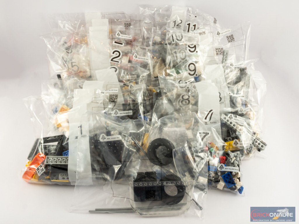 A l’intérieur de la boîte, 23 sachets numérotés de 1 à 12, et un 24ème non numéroté contiennent les 2352 pièces du modèle. Chose nouvelle, plutôt qu’une pochette plastique, la notice d’instructions et la planche de stickers sont contenus dans une pochette en carton rigide. Pochette qui aura au moins le mérite d’éviter de recevoir une notice pliée en deux ou des autocollants inutilisables. Et qui s’inscrit dans la démarche de LEGO vers des emballages issus de matériaux durables.
