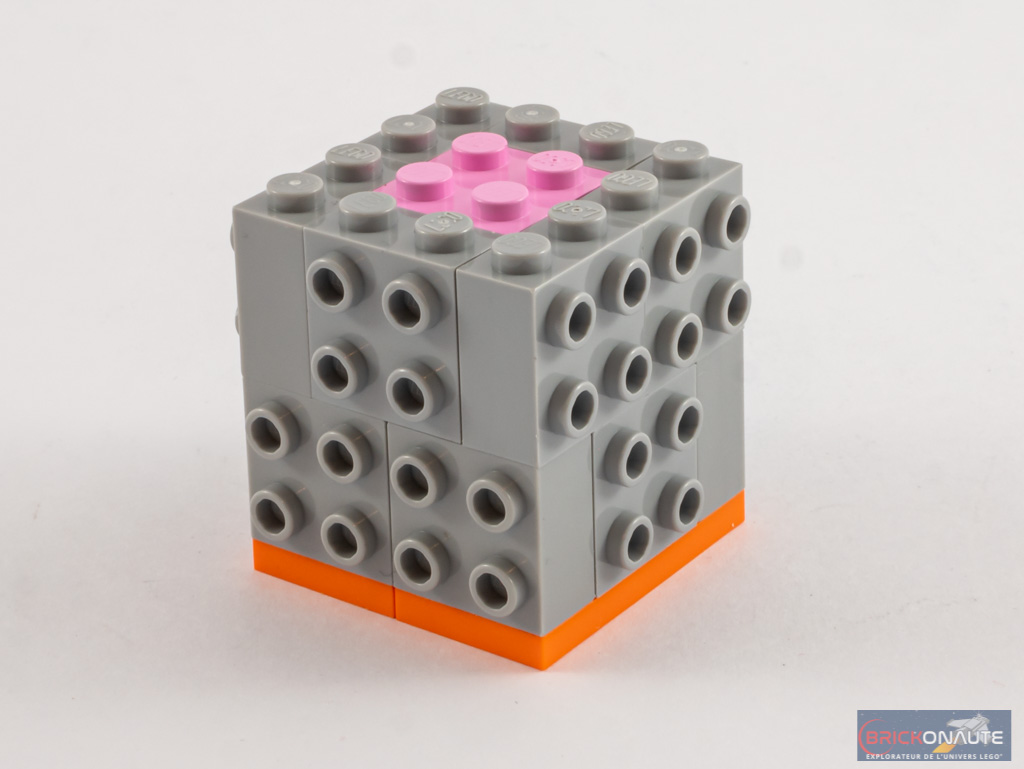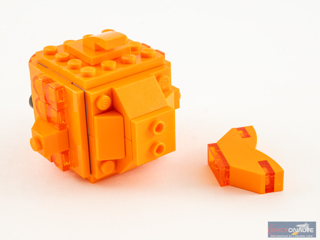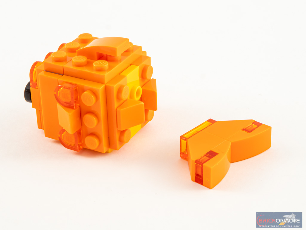 Une fois la structure réalisée (4x4x4 tenons pour l’adulte / 3x3x3 pour le petit), on habille les différentes faces avec le « visage » sur l’avant, des nageoires sur les côtés et au dessus, et la queue à l’arrière. Le designer a utilisé des petites tiles oranges translucides pour les écailles et quelques éléments de la queue, et le résultat est plutôt convaincant.
