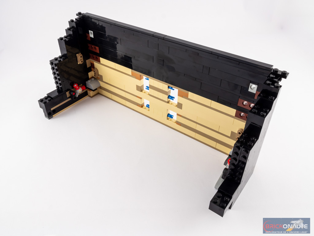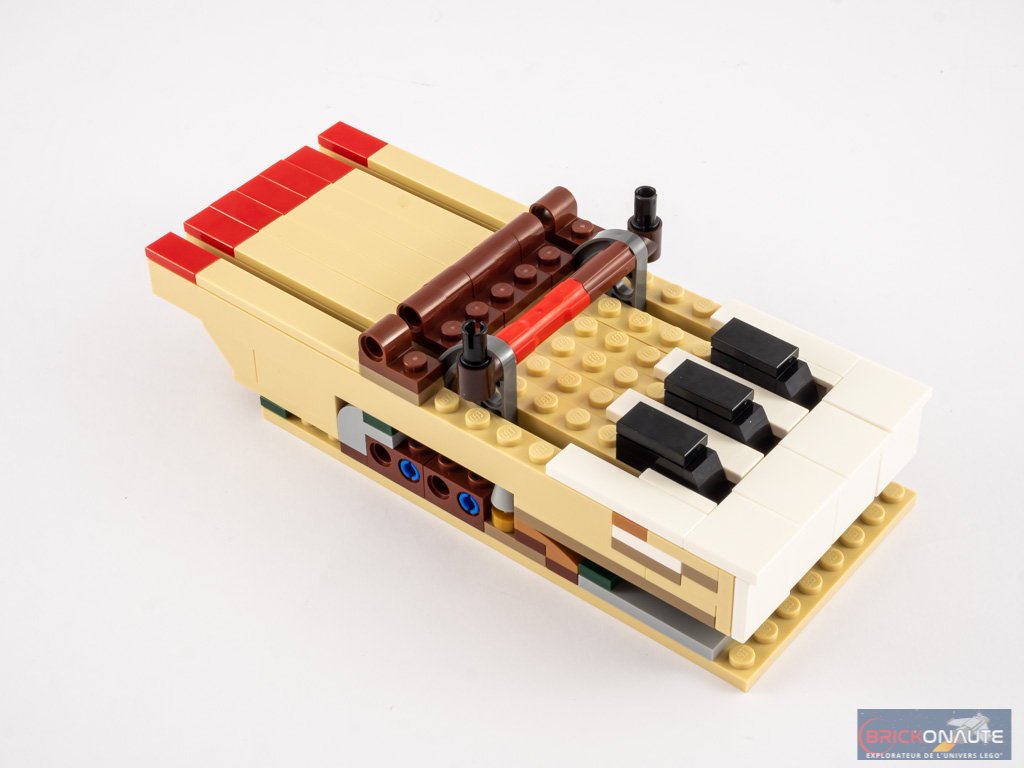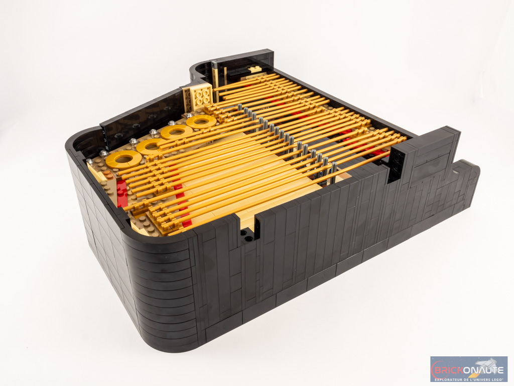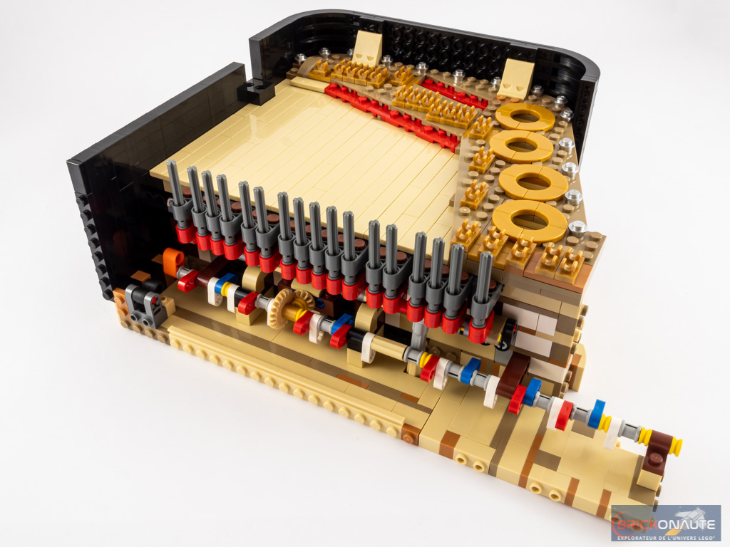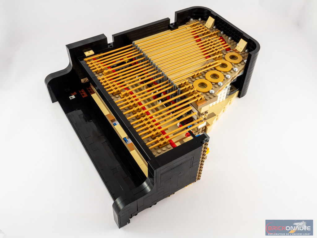 Ouvert, le piano dévoile ses entrailles et sa table d’harmonie, avec ses 25 touches et ses 25 marteaux qui viennent chacun taper contre leur corde dorée, ses quelques touches de rouge et ses ouïes dorées, et ses étouffoirs hormis sur les notes les plus aigües comme sur un vrai piano. N’oublions pas non plus la touche finale : une grande tile de 6×6 tenons blanche, tampographiée d’un morceau composé par le fan designer du set, Donny Chen.