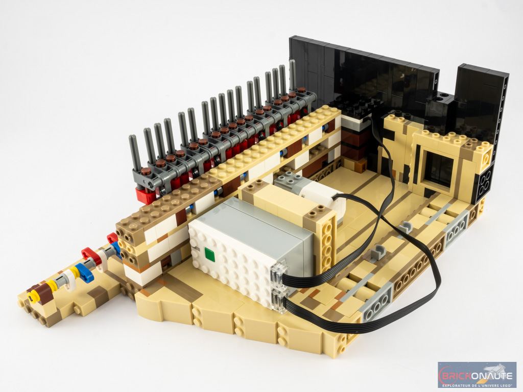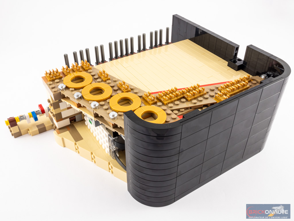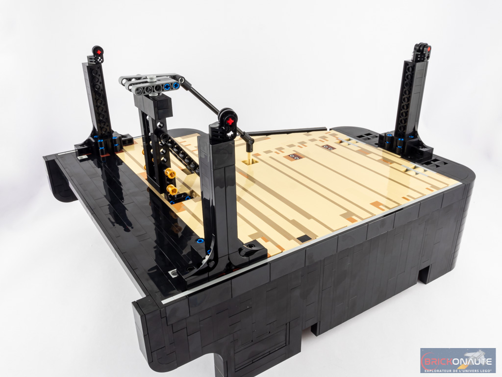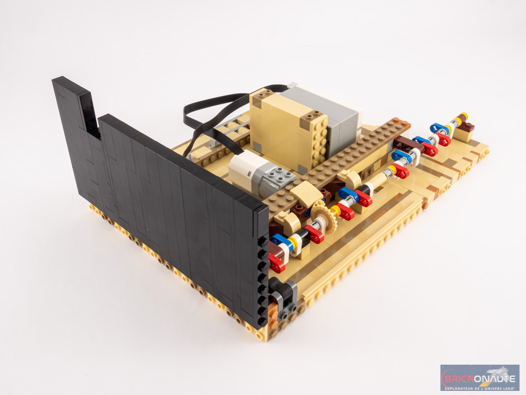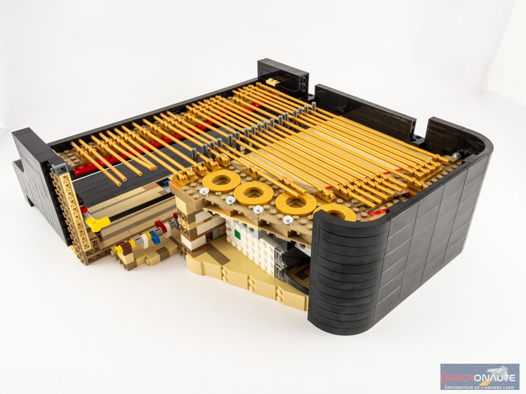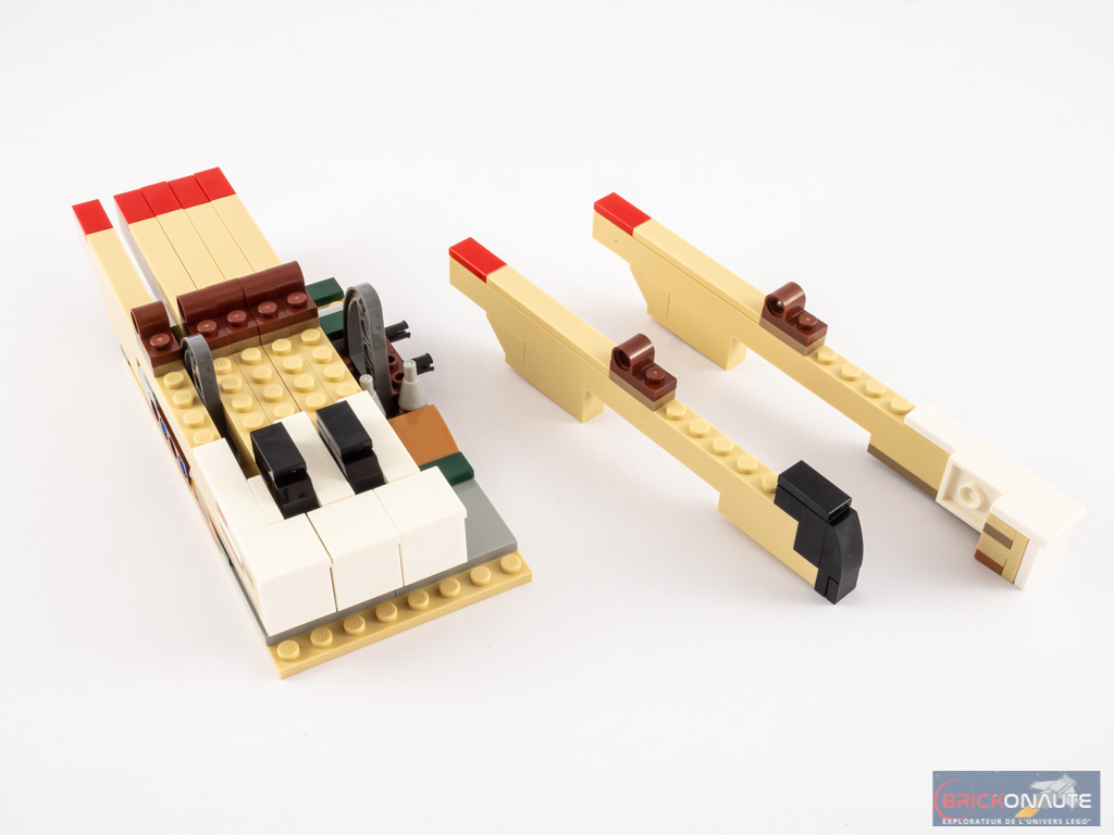 Ouvert, le piano dévoile ses entrailles et sa table d’harmonie, avec ses 25 touches et ses 25 marteaux qui viennent chacun taper contre leur corde dorée, ses quelques touches de rouge et ses ouïes dorées, et ses étouffoirs hormis sur les notes les plus aigües comme sur un vrai piano. N’oublions pas non plus la touche finale : une grande tile de 6×6 tenons blanche, tampographiée d’un morceau composé par le fan designer du set, Donny Chen.