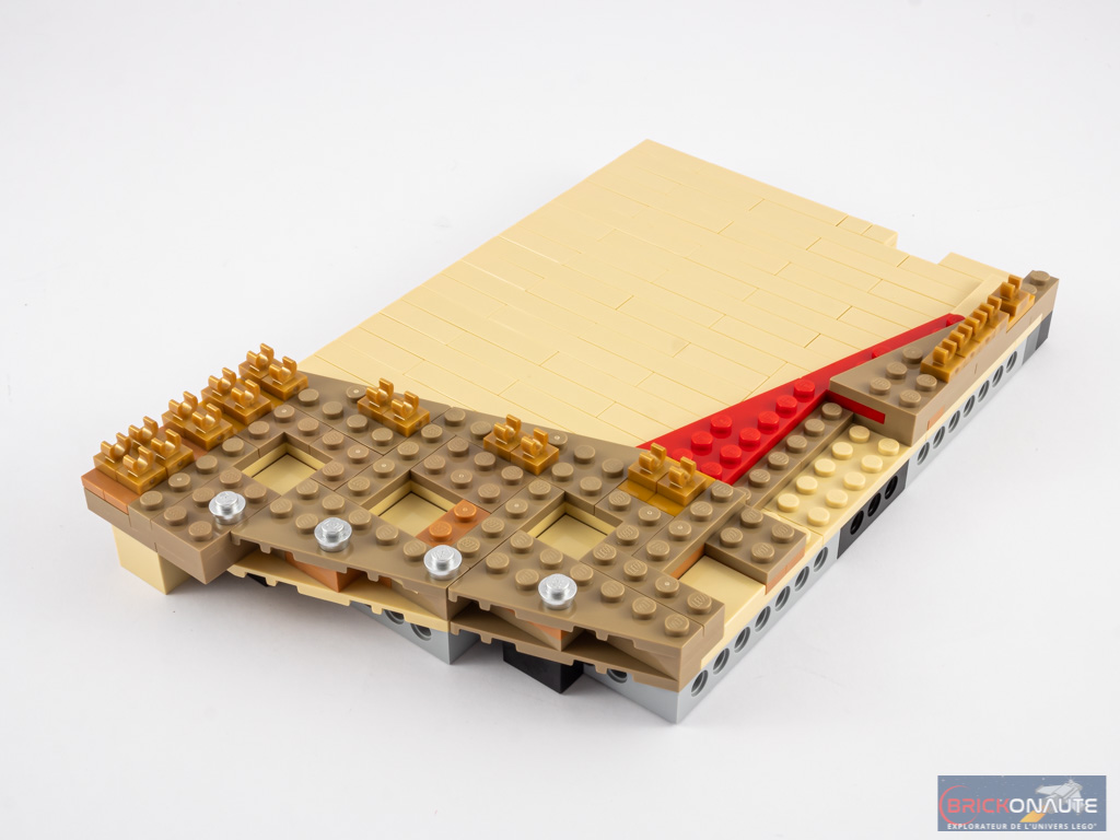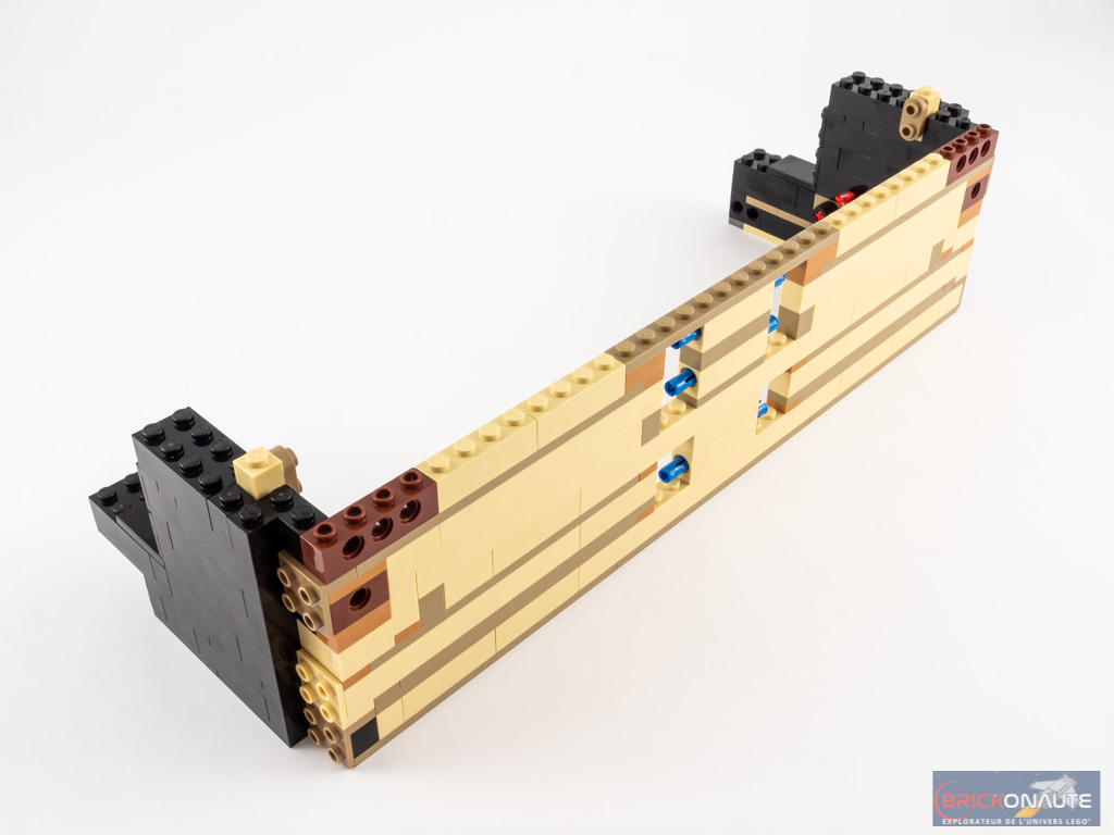 Nous nous occupons alors de la table d’harmonie. Il s’agit pour l’essentiel d’une structure à base de cadres Technic couverte de plates et de tiles de couleur tan. Quelques éléments dark tan apportent un peu de relief à l’ensemble, et quelques clips dorés sont disposés en attendant les cordes.