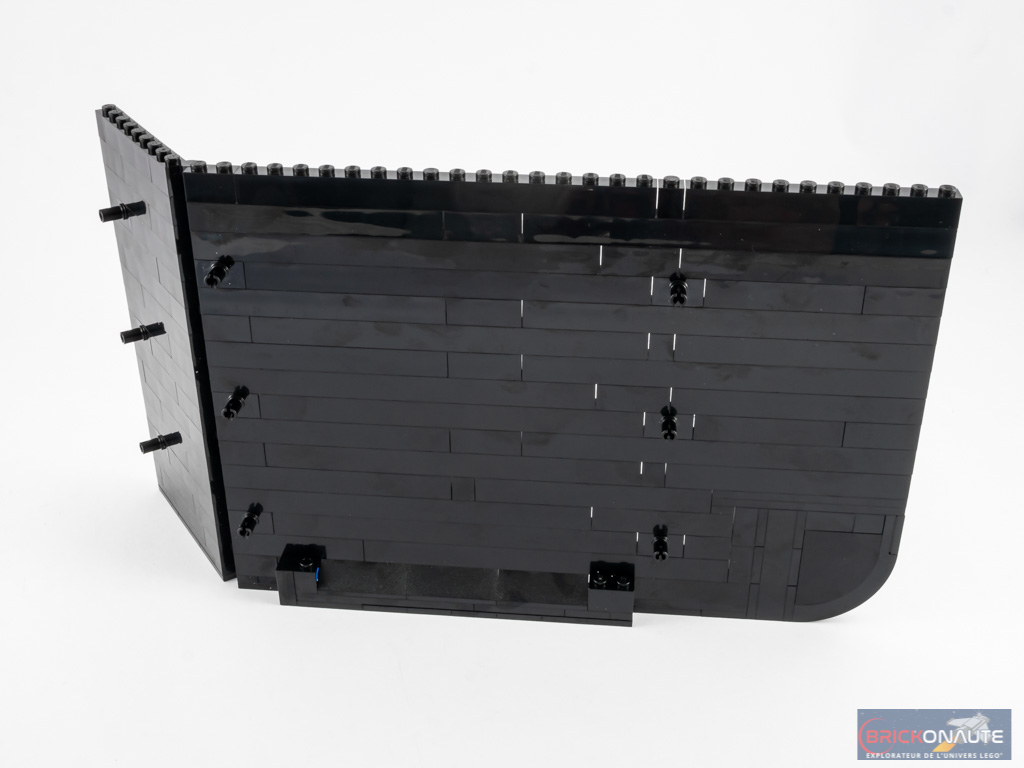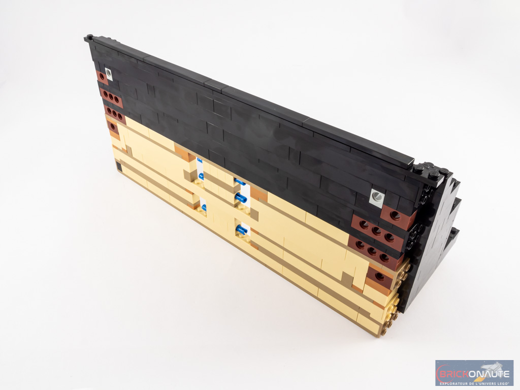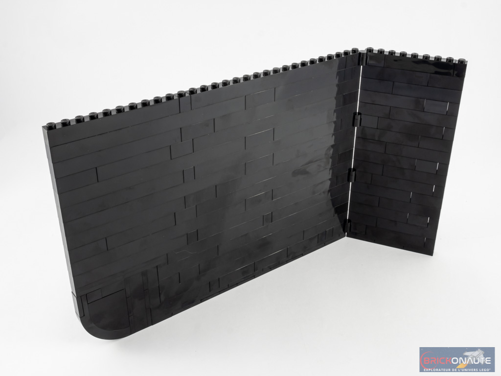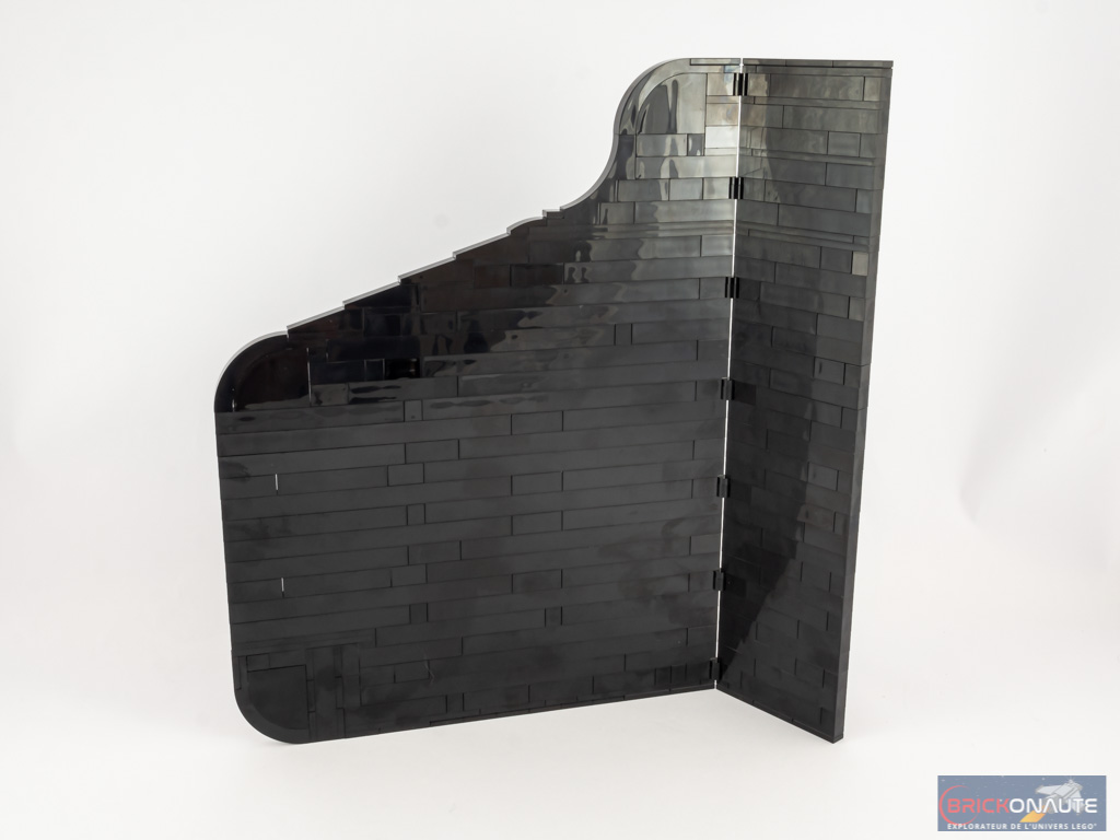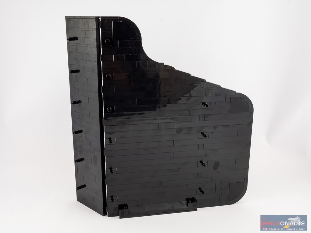 Nous nous attaquons alors au grand couvercle. Sa conception est assez simple : il s’agit d’empiler des briques noires en deux morceaux reliés entre eux par quelques charnières. Les pièces arrondies dans les coins permettent d’épouser la forme du piano.