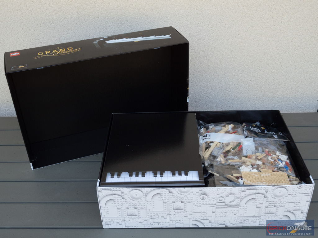 La boîte s’ouvre proprement en 2 parties. On y trouve quelques sachets en vrac, et une boîte avec un motif de piano contient d’autres sachets. En tout, nous avons 33 sachets numérotés de 1 à 21, et 3 sachets non numérotés avec les tiges dorées (les futures cordes), quelques plates et les éléments Powered UP!. On trouve également en vrac un grand axe Technic et 3 plates 6×16 de couleur tan.