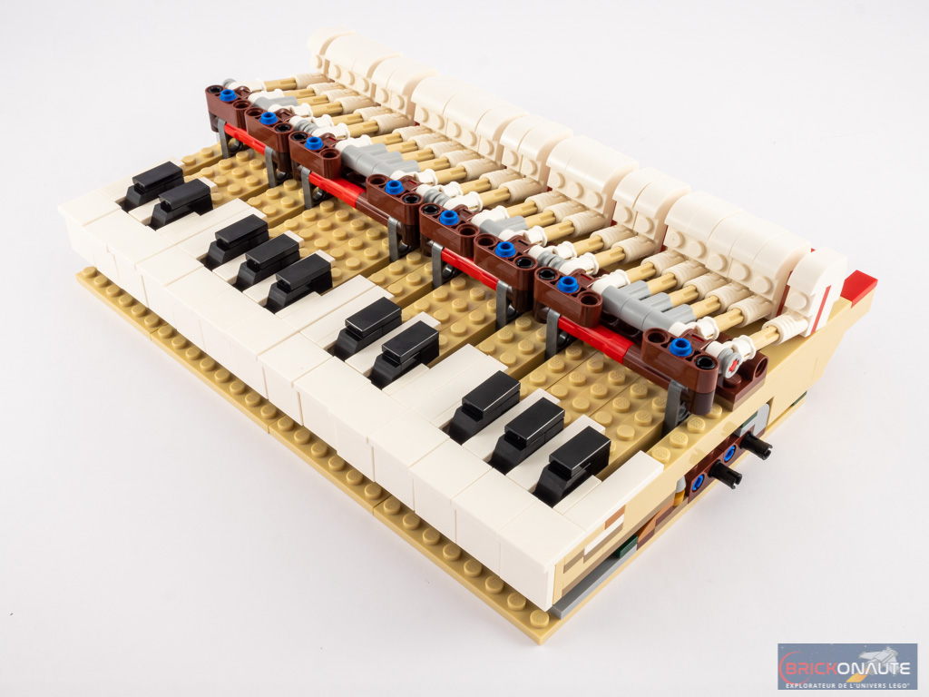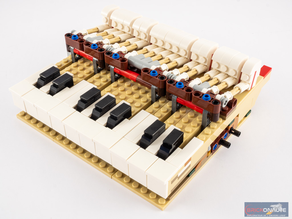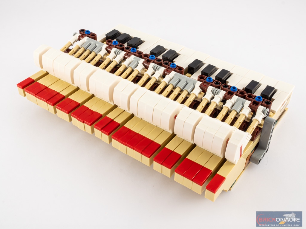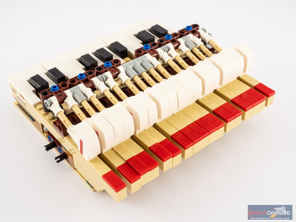 - Le clavier est aisément détachable pour observer la mécanique. Il suffit pour cela de retirer deux axes Technic situés sous le piano, et de retirer le sous-ensemble constitué du cadre et du couvercle du clavier, pour pouvoir également enlever celui-ci.
