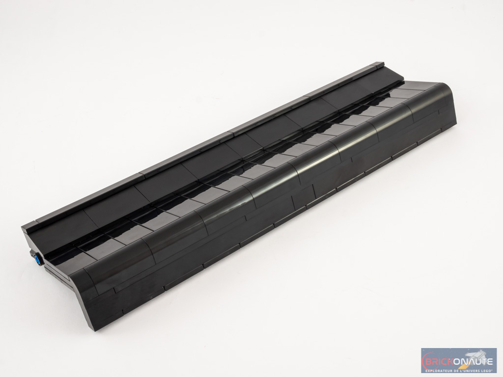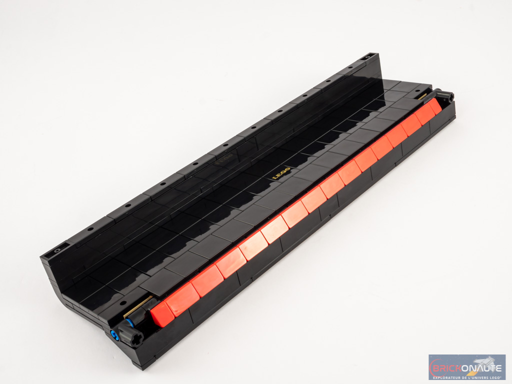 Nous nous occupons alors du couvercle du clavier. Celui-ci est complètement lisse y compris côté intérieur grâce à l’utilisation d’inverted tiles. Remarquez également la superbe tampographie LEGO sur l’une d’entre elles, à l’encre dorée à la manière des grandes marques de pianos. Ce couvercle permet, une fois mis en place, de masquer complètement les tenons visibles sur les touches : il s’ajuste parfaitement.