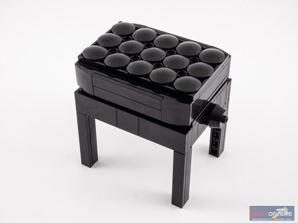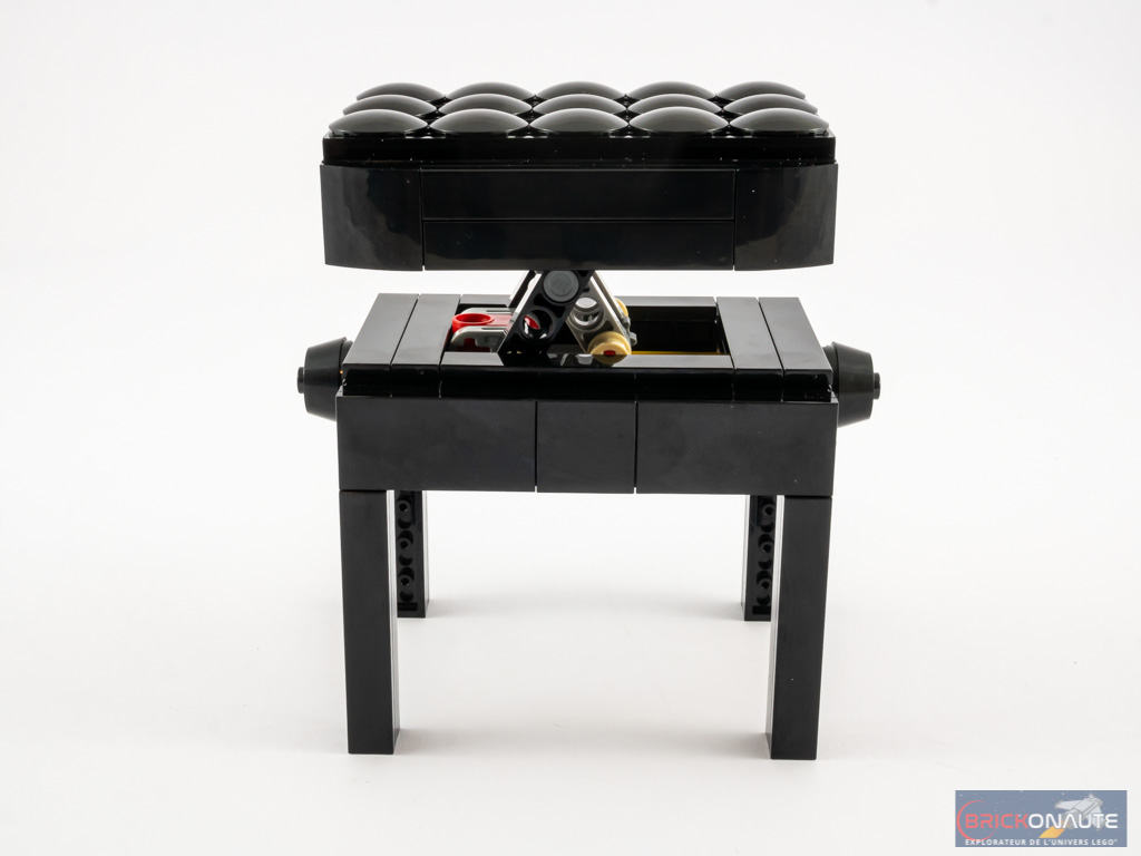 Mais c’est bien le seul écueil en termes de design, car pour le reste c’est du tout bon. LEGO nous livre ici un design presque totalement studless (sans tenons visibles) et c’est plutôt rare. La finition noire est impeccable, avec ces quelques touches dorées lorsque le piano est fermé. Mis à part ce « problème » d’épaisseur, les proportions sont bonnes et les courbes sont superbes, grâce à l’utilisation de pièces relativement rares permettant ces formes complexes. Rien n’a été laissé au hasard : même les pieds et le tabouret sont superbement réalisés. Tout juste notera-t-on quelques axes Technic rouges visibles au niveau des roulettes, ou quelques pins Technic au niveau des pédales.