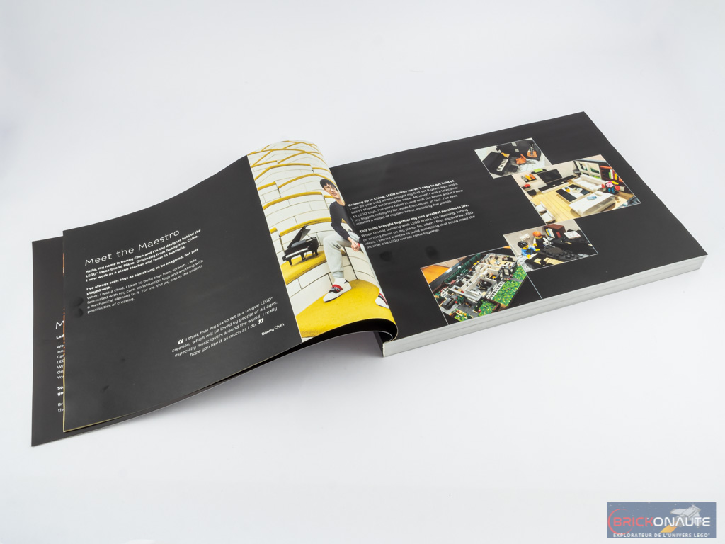 La notice compte 564 pages pour 840 étapes de construction. Au début, nous retrouvons comme de coutume dans la gamme LEGO Ideas quelques mots du fan designer : Donny Chen, qui dans la vraie vie est professeur et accordeur de piano en Autralie. Les designers LEGO sont également présentés : Woon Tse Chee, Main LEGO Designer, dont la femme est professeure de piano ; et Steen Sig Andersen qui a travaillé sur le mécanisme. Au fil des pages de la notice, on trouve également quelques citations de musiciens et compositeurs célèbres et quelques notes de musique.