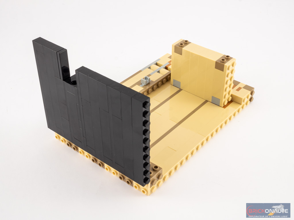 L’étape suivante voit l’assemblage d’une première partie du support du clavier. Il s’agit ici d’un fond de couleur tan, et de deux parois noires. Quelques pièces disposées sur les parois sont chargées de guider l’insertion du clavier si on décide de le sortir (j’y reviendrai). Notez les espaces vides : il s’agira ensuite d’y installer le pédalier.