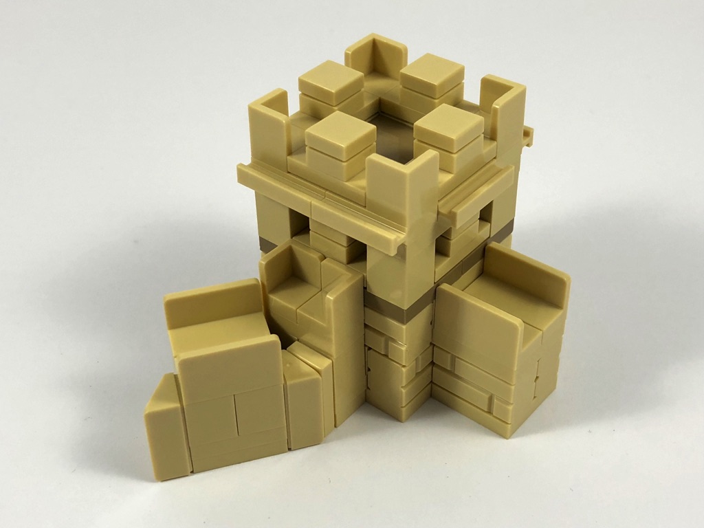 On continue de la même manière en assemblant la partie intermédiaire, qui recevra le corridor reliant les deux tours et la plus basse d’entre elles. C’est assez difficile à distinguer sur la photo, mais une fois la partie intermédiaire couverte de tiles on vient laisser dans l’interstice une boule, futur support de la tour. Petite technique de construction intéressante, qui tranche avec l’étape précédente plutôt monotone.
