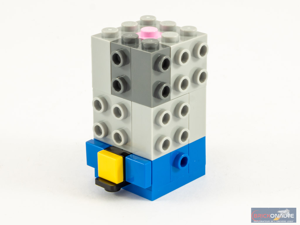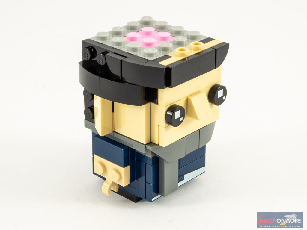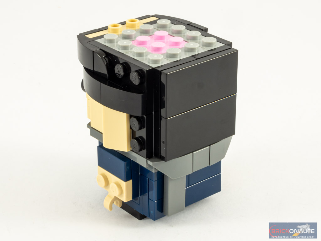 La construction de Gru est un peu différente de ce à quoi LEGO nous a habitués avec la gamme LEGO BrickHeadz. Et cette différence réside dans la conception du torse, basé sur 4 brackets en vis-à-vis. Les bras sont construits sur des briques SNOT et directement assemblés au torse. Sur ce torse, on vient ajouter une grosse écharpe, avant de nous occuper de la tête. Rien de spécial à mentionner pour celle-ci, sa conception est très classique à base de 12 briques SNOT et d’un « cerveau » représenté par une brique rose – on vient « habiller » cette structure sur toutes ses faces pour donner vie à Gru.