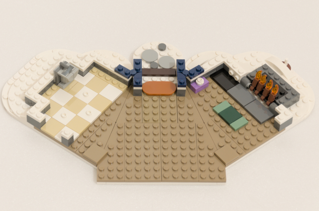 Fin de construction de la plaque “base”. Pour ceux qui construisent quelques bâtiments, nous avons ici ce qui se fait d’assez classique en termes de technique. Un enchaînement de grands espaces, de carrelages, d’objets et de murs. La première étape se fera par le carrelage de la cuisine et la mise en place des premiers murs. Ensuite, nous parcourons le long de la plaque pour aller à l’entrée avec son paillasson et finir vers la cheminée et son foyer constitué de quatre bougies inclinables qui laissent ainsi (autre fonctionnalité) passer notre futur Père Noël en mode glissade par la cheminée pour finir par terre dans le salon.