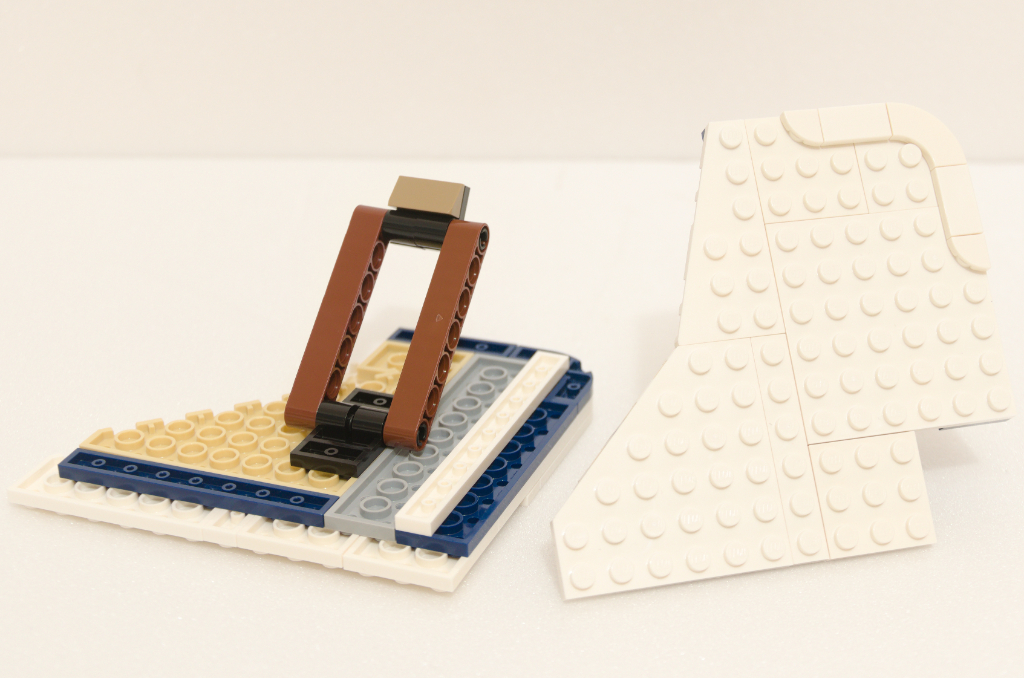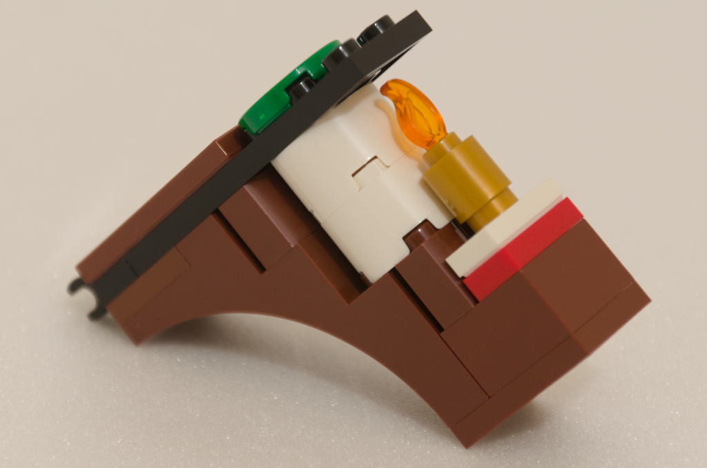 L’avant-dernier sachet permettra de finaliser la maison avec la construction du chien-assis en partie centrale de la maison. Tout comme pour la charpente, c’est principalement avec des sous-ensembles que tout prend forme. Tout d’abord, nous obtenons la base du chien-assis puis la partie contenant la bougie et un bout de charpente.