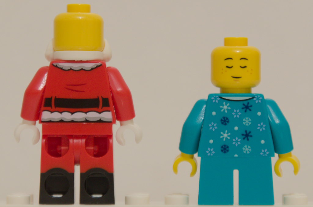 Et oui, on ne peut pas passer à côté des quatre minifigurines. Les parents sont réussis sans non plus être transcendants. Les torses sont bien réalisés mais les pantalons sont unis. Tous les deux ont le droit à un double visage, un côté souriant et un autre complètement euphorique (magie de noël oblige).