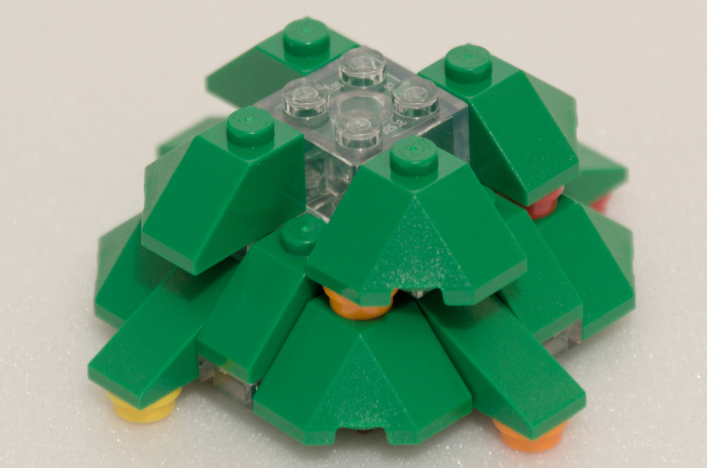 La seconde partie du sachet est donc orientée vers le sapin et les cadeaux. Tout d’abord, nous constituons le socle qui accueille le sapin. Sa base marron en deux tons est sobre et fait le boulot. Pour ce qui est du sapin, nous faisons par couches successives de branchages du plus large au plus étroits tout en parsemant quelques boules colorées par-ci par-là.
