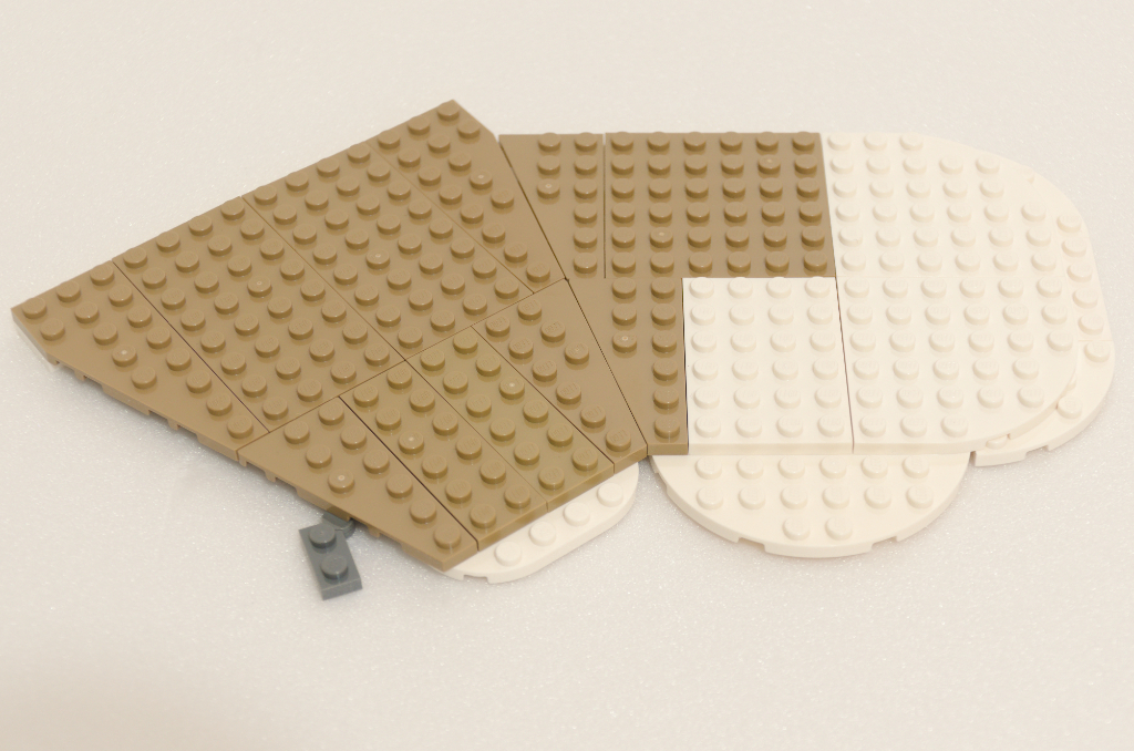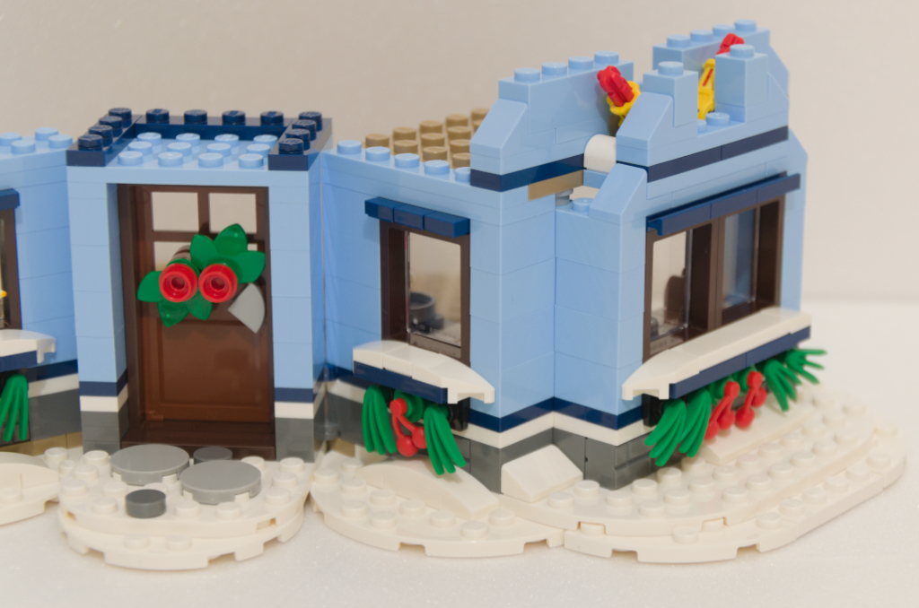 Nous voilà donc devant le principal attrait de ce set, la maison bleue qui reçoit donc la visite du Père Noël. Logiquement, le début se fait par les fondations à grand coups de plaques beiges pour l’intérieur et blanches pour l’extérieur. La construction débute par la partie centrale sur laquelle viendra se fixer les deux ailes latérales.