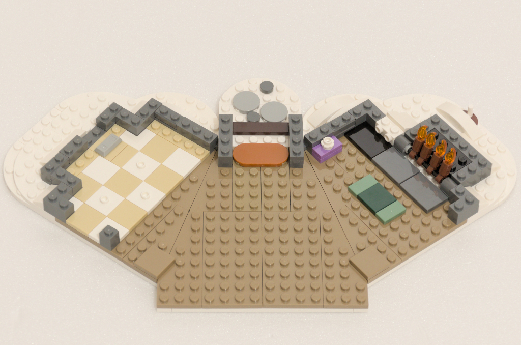 Fin de construction de la plaque “base”. Pour ceux qui construisent quelques bâtiments, nous avons ici ce qui se fait d’assez classique en termes de technique. Un enchaînement de grands espaces, de carrelages, d’objets et de murs. La première étape se fera par le carrelage de la cuisine et la mise en place des premiers murs. Ensuite, nous parcourons le long de la plaque pour aller à l’entrée avec son paillasson et finir vers la cheminée et son foyer constitué de quatre bougies inclinables qui laissent ainsi (autre fonctionnalité) passer notre futur Père Noël en mode glissade par la cheminée pour finir par terre dans le salon.