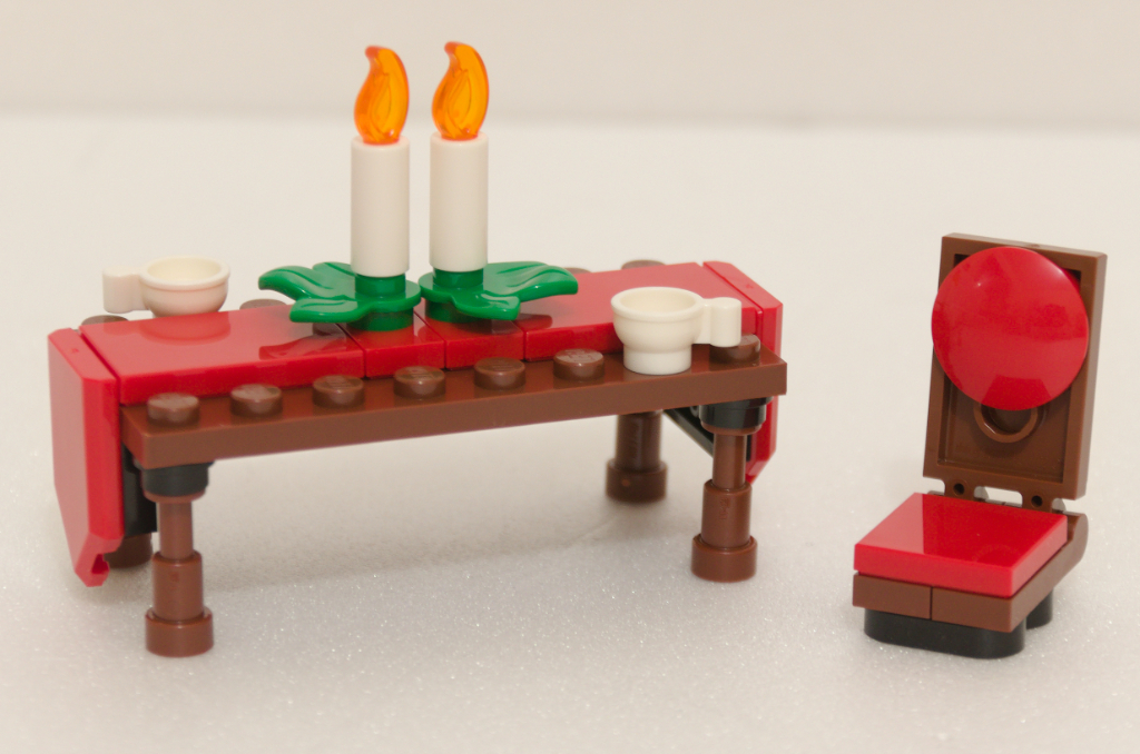 Pour finir le sixième sachet, nous construisons la table et les quatre chaises rouges qui prennent place en plein centre de la maison. La table est joliment décorée d’un chemin de table rouge et de deux bougies.