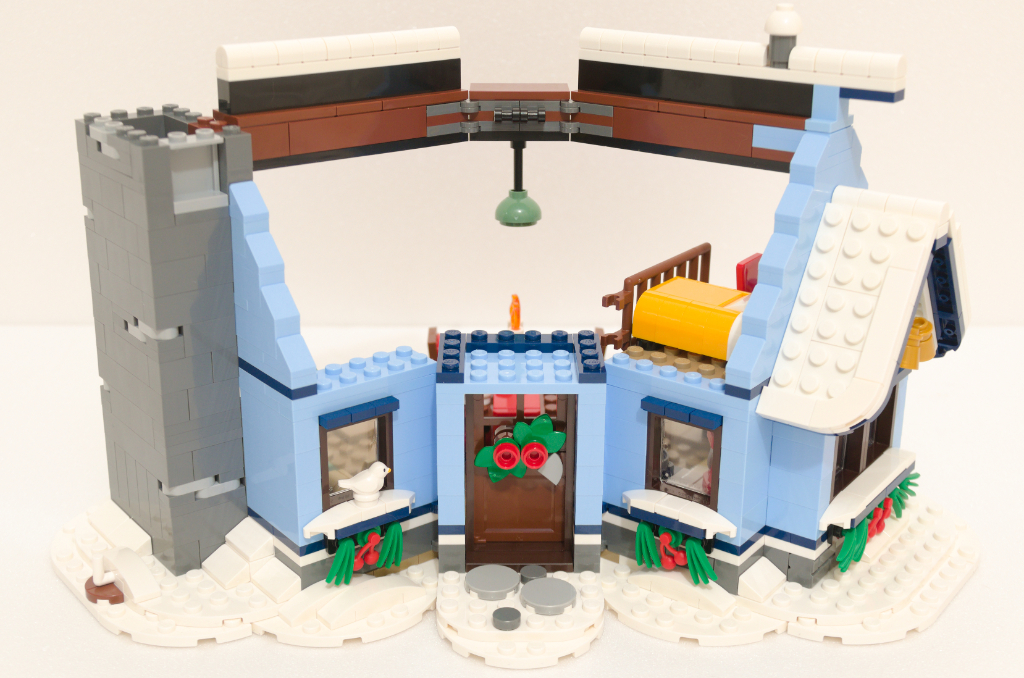 Le premier extérieur à assembler est la barrière d’entrée. Celle-ci repose sur un socle enneigé et est accompagnée de quelques accessoires, tels qu’une lampe et une boîte aux lettres. Ce premier montage est assez vite fait et ne présente aucune difficultés en particulier. Le résultat est plutôt convaincant.