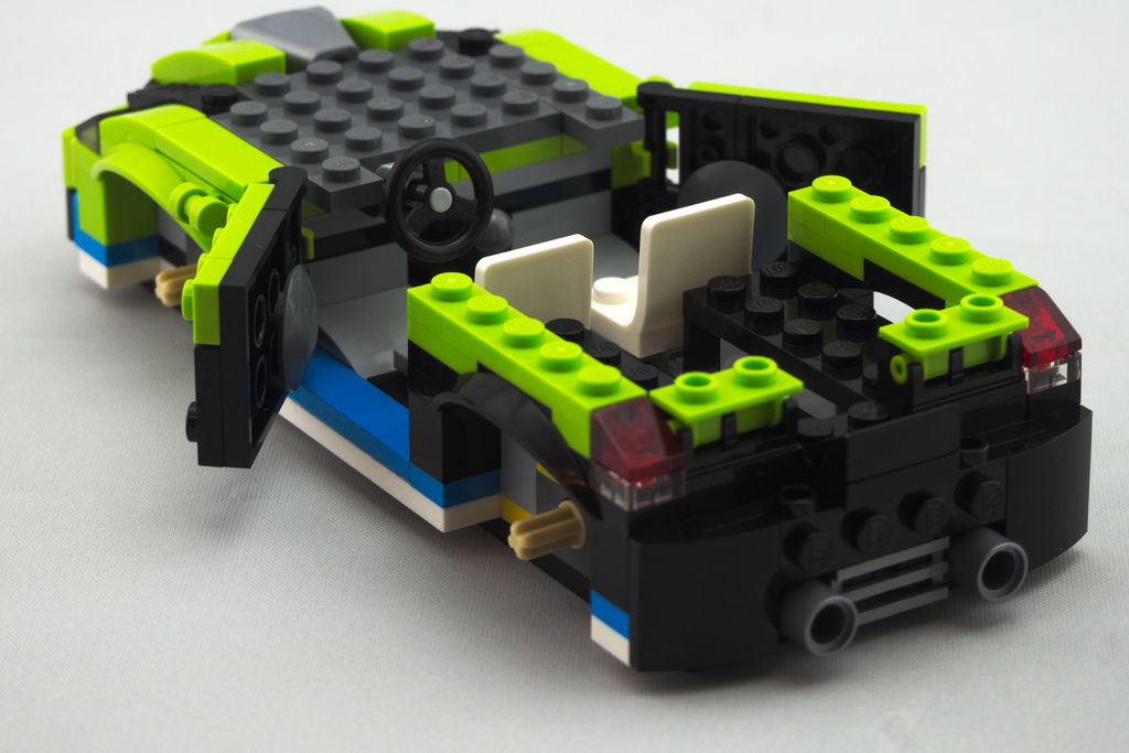 Ça débute naturellement par le châssis, à base de deux plate 2×16, puis un assemblage de pièces pour obtenir une taille finale de 17 tenons de long par 8 de large. A l’avant se trouve le mécanisme qui fera lever la future prise d’air pour le moteur. On passe à l’habillage, de l’arrière jusqu’à l’avant, avec les passages de roues, les feux brick built, les deux sièges (deux minifigs peuvent tenir dans le véhicule), le volant et le levier de vitesse. Le montage du capot se termine en installant la prise d’air amovible.