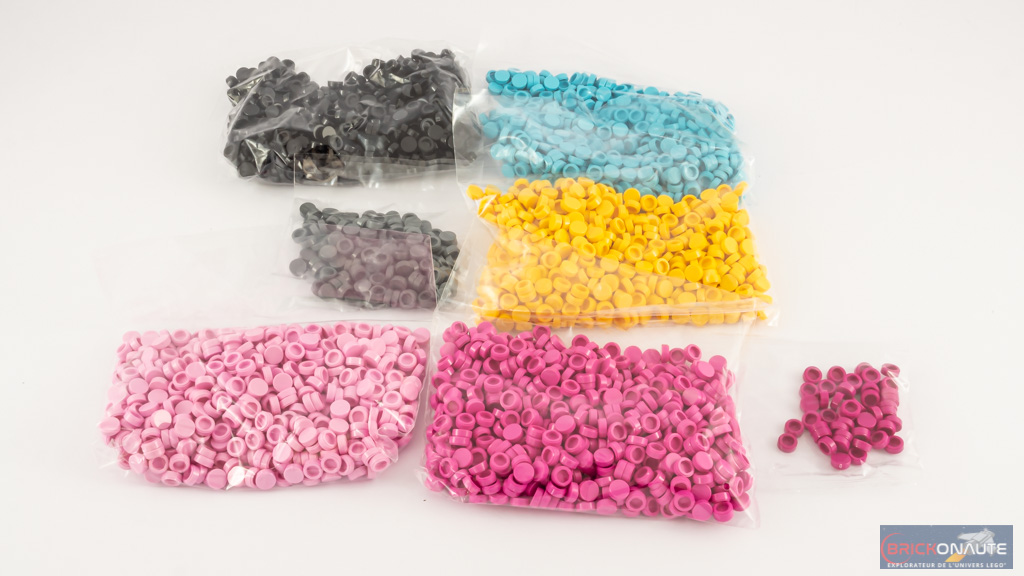 A noter parmi les pièces intéressantes de nouvelles couleurs pour les round tiles : dark pink (x587), magenta (x46) et medium azure (x587). Pour le moment, elles sont exclusives à cette boîte. Notez également la tile tampographiée avec la signature d’Andy Warhol.