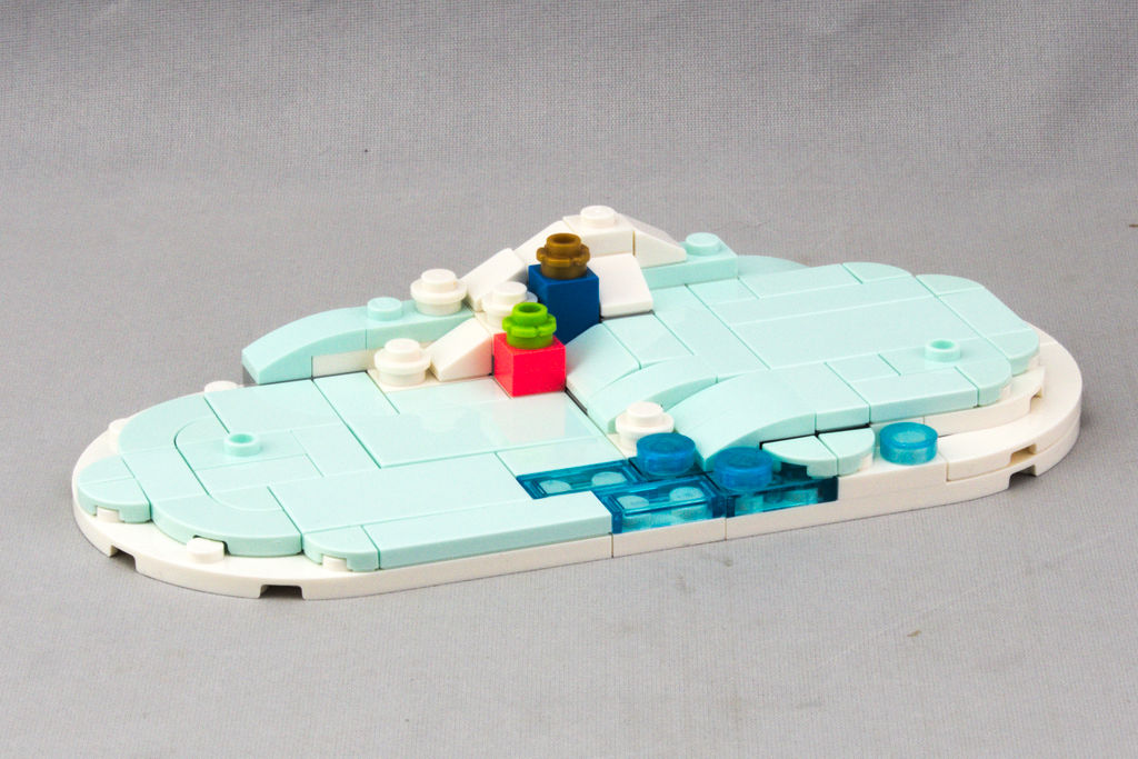 Le deuxième assemblage est le support qui accueillera les ours et le sapin de Noël. La construction est simple, mais riche en petits éléments. Les couleurs, blanche et aqua, fonctionnent bien, avec quelques éléments trans-light blue pour la glace. Toute la surface est couverte de tiles avec deux tenons pour positionner nos ours. Au fond un petit monticule servira pour le sapin, où deux petits cadeaux prennent place.
