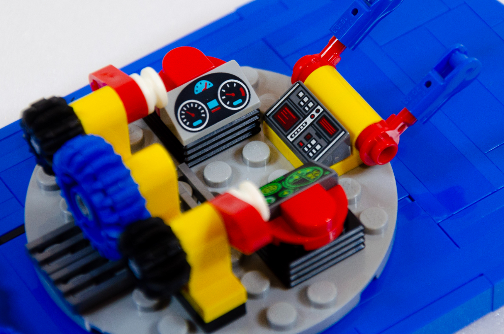 J’aime aussi le petit bonus du poste de pilotage où la minifigurine peut prendre place. Ce dernier est très sobre mais efficace, les écrans de contrôle sont beaux et les engrenages tournant dans le vide me font penser aux méninges qui carburent, c’est rigolo.