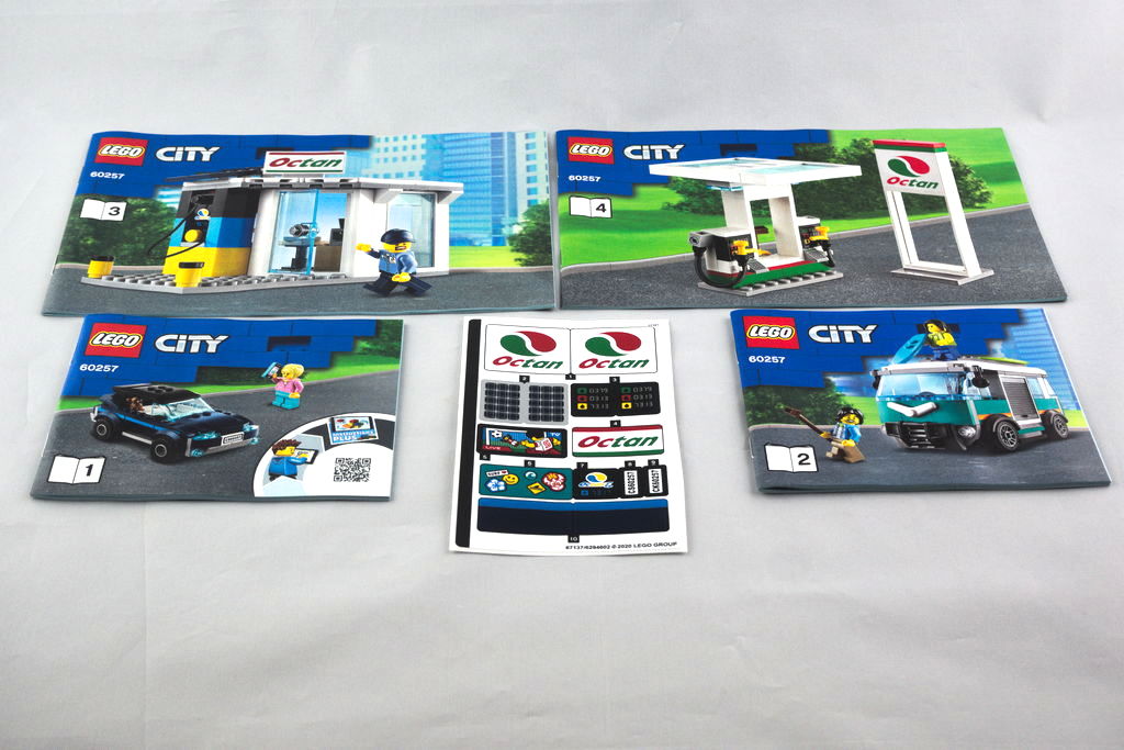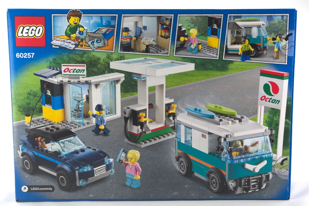 Sur la face avant de la boîte, on trouve la station service en pleine activité, montrant l’ensemble des minifigurines, véhicules et bâtiments présent dans le set. On a un cadre verdoyant avec en fond de grands immeubles caractérisant bien qu’on est dans la gamme City. Au dos, une vue un peu différente de l’ensemble du set avec quatre vignettes montrant diverses possibilités offertes et qu’à l’intérieur les sachets sont numérotés.