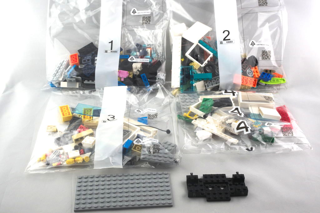 L’intérieur contient quatre sachets numérotés, ainsi qu’une plaque grise de 8×16 et un nouveau châssis. On a également quatre notices, permettant de construire indépendamment chaque véhicule ou bâtiment, et une planche de dix autocollants.