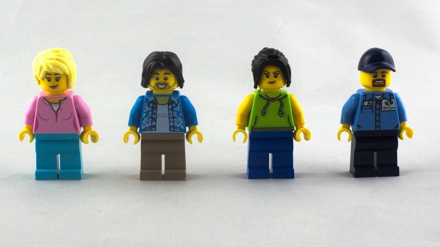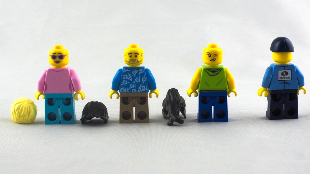 On en compte quatre dans ce set : deux femmes et deux hommes. Rien d’inédit, toutes les jambes sont unies et les torses vus dans d’autres sets. Cela reste dans le thème avec notre employé de la station service aux couleurs d’Octan, ou encore la chemise à fleurs et le sweat à capuche de nos surfeurs. Trois des minifigs ont un double visage, dissimulés sous leurs cheveux. On a également un chihuahua (absent sur les photos ci-dessous) en animal de compagnie.