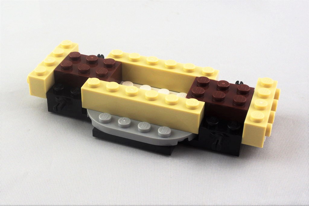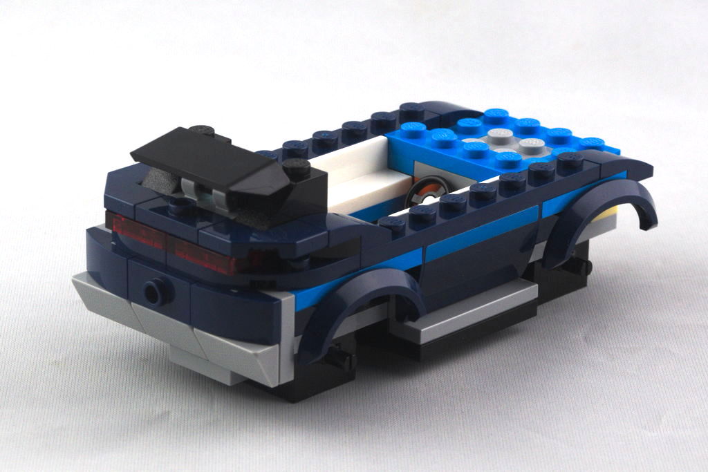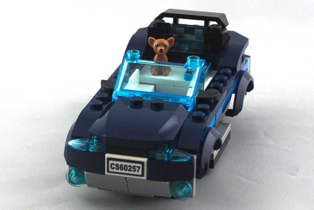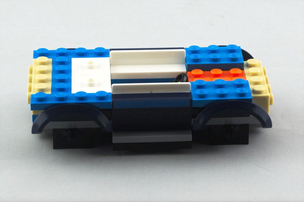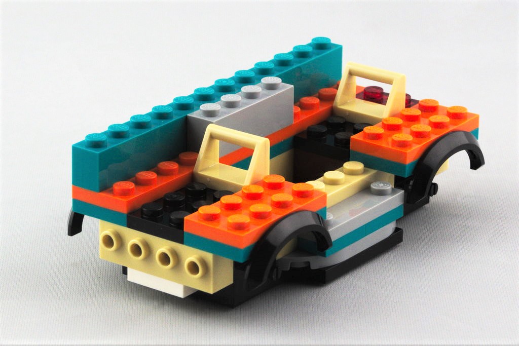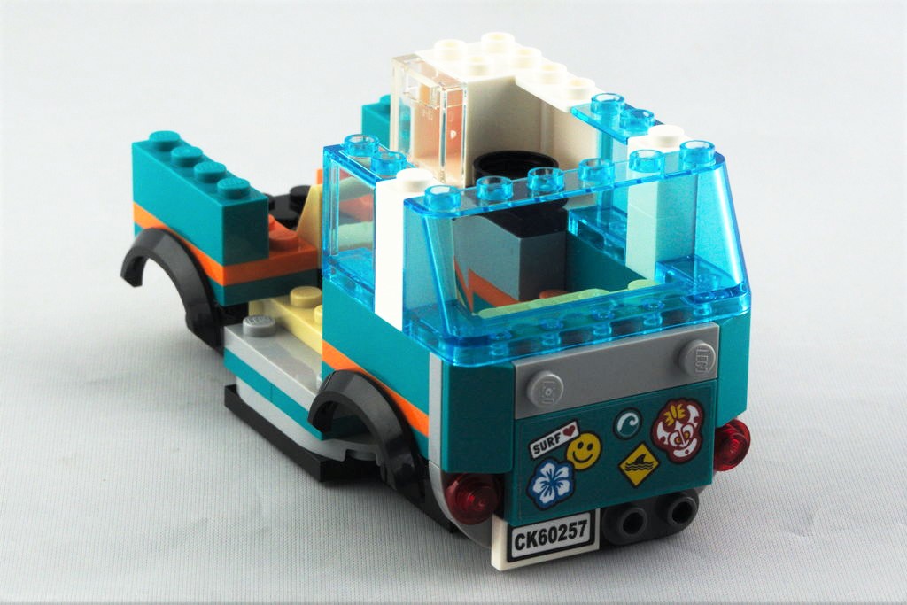 La pièce de châssis, apparue cette année, équipe pour le moment les véhicules de six sets de la gamme City. Une fois agrandie avec quelques pièces, on a là aussi une dimension de 12 sur 6 tenons. On continue avec l’emplacement des deux sièges et le côté droit contient un petit frigo et une plaque de cuisson avec sa poêle. Au tour de l’arrière avec sa large vitre, des feux brick built, et des autocollants pour la plaque d’immatriculation et une décoration sur le thème du voyage et du surf, bien l’esprit du véhicule. Côté gauche, c’est une porte s’ouvrant vers le haut qui permet d’accéder à l’intérieur. L’avant se dote d’un grand pare-brise, un pare-buffle, ainsi que de petits rétroviseurs ronds et d’un boomerang en guise de calandre. On a un côté vintage, qui s’inspire fortement des vieux Combi Volkswagen. On termine avec le toit blanc et ses deux planches de surf accrochées, ainsi que les quatre roues.