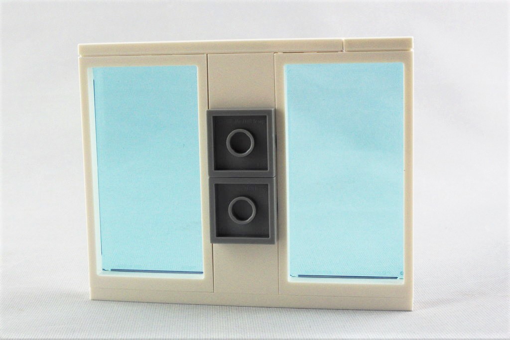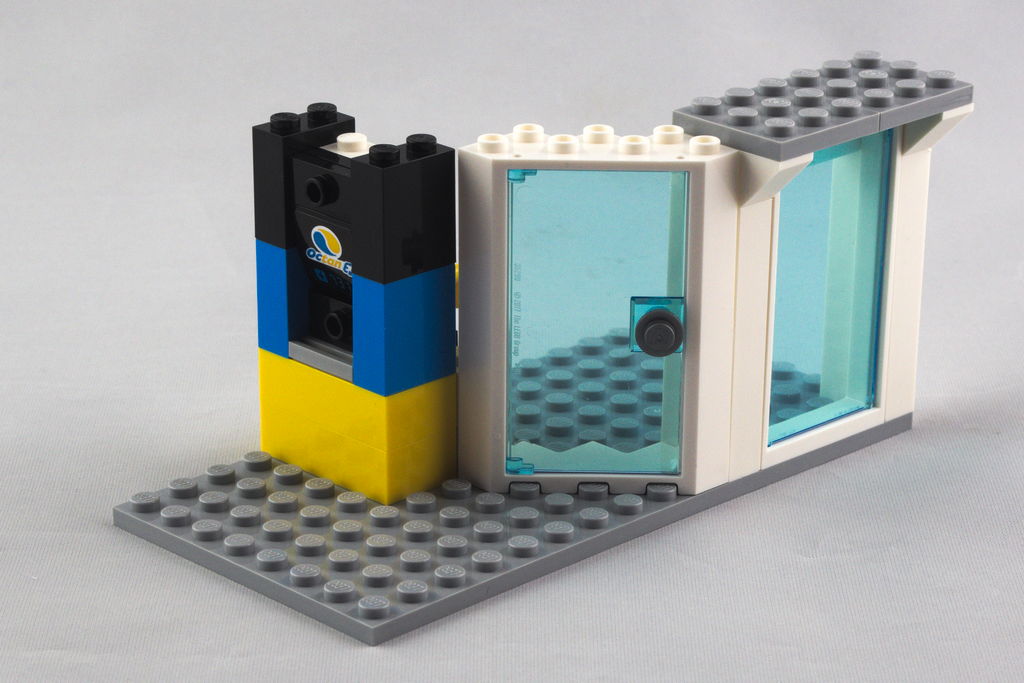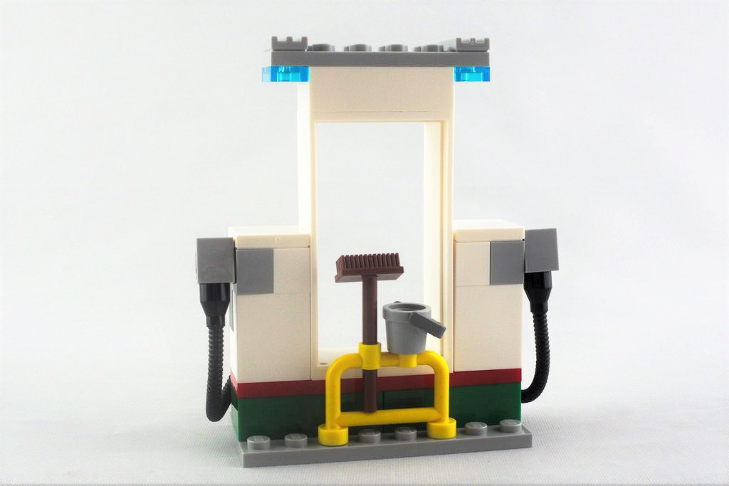 Dernier élément essentiel de la station service, on commence par monter les deux pompes, symétriquement identiques, avec leurs tuyaux et leurs écrans (autocollants). De l’autre coté, on pose rapidement un seau et un balai pour nettoyer son véhicule. Un épais cadre surmonte les pompes pour y poser une verrière constituée de deux cadres vitrées en bleu translucide, tout comme les deux plaques 1×2 pour l’éclairage nocturne.