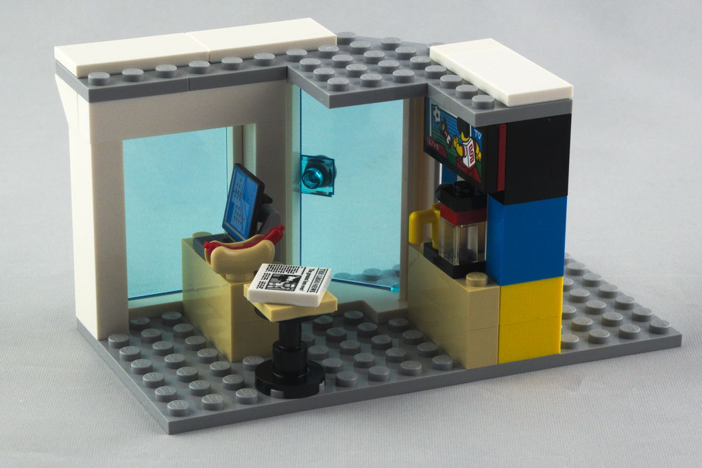 La boutique tient sur la plaque grise de 8×16, qui se monte rapidement avec seulement deux côtés à construire. On trouve une borne de recharge pour véhicules électriques avec son câble. La borne et l’autocollant Octan-E aborde ici des couleurs spécifiques bleu et jaune, pour mieux se différencier du classique Octan. L’extérieur se complète avec une paroi vitrée et une porte en angle également vitrée. L’intérieur, bien que petit, permet de contenir une caisse, une machine à café pour accompagner son hot dog, ainsi qu’un journal et une télévision allumée sur un match de football en direct. On termine avec la bordure du toit (en l’absence d’un vrai toit) comportant le logo Octan et deux panneaux photovoltaïques (toujours des autocollants…)