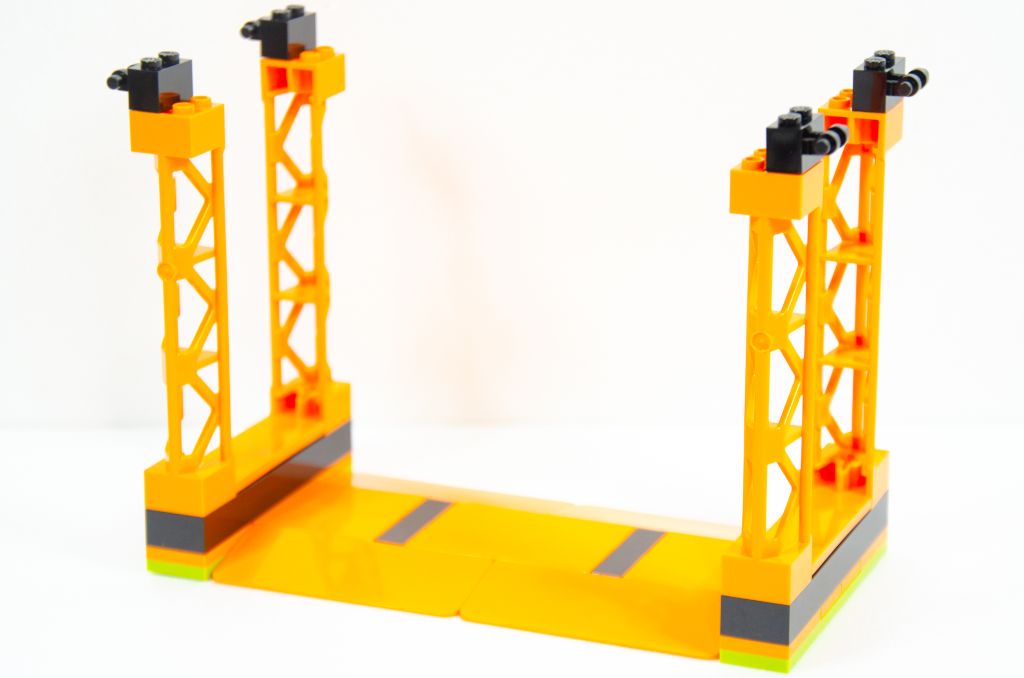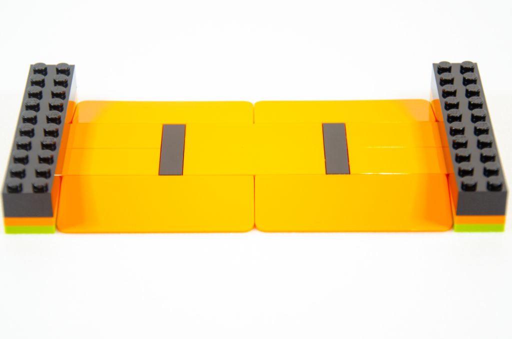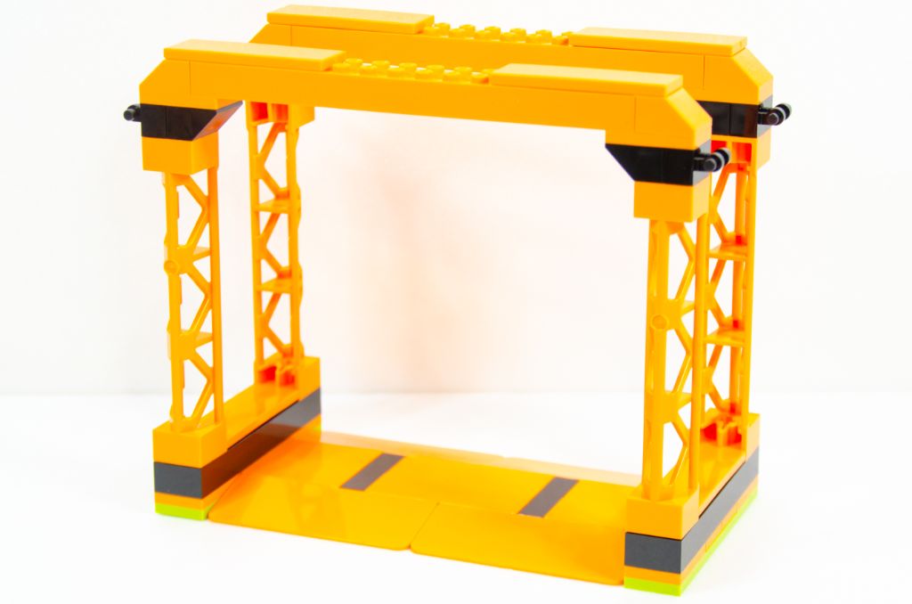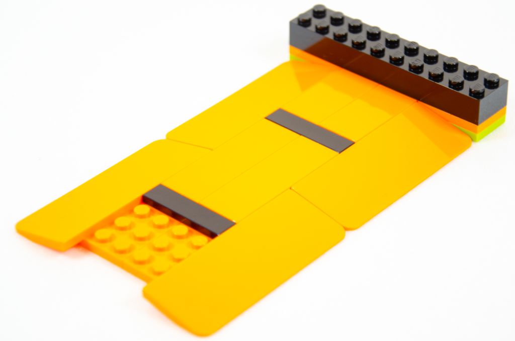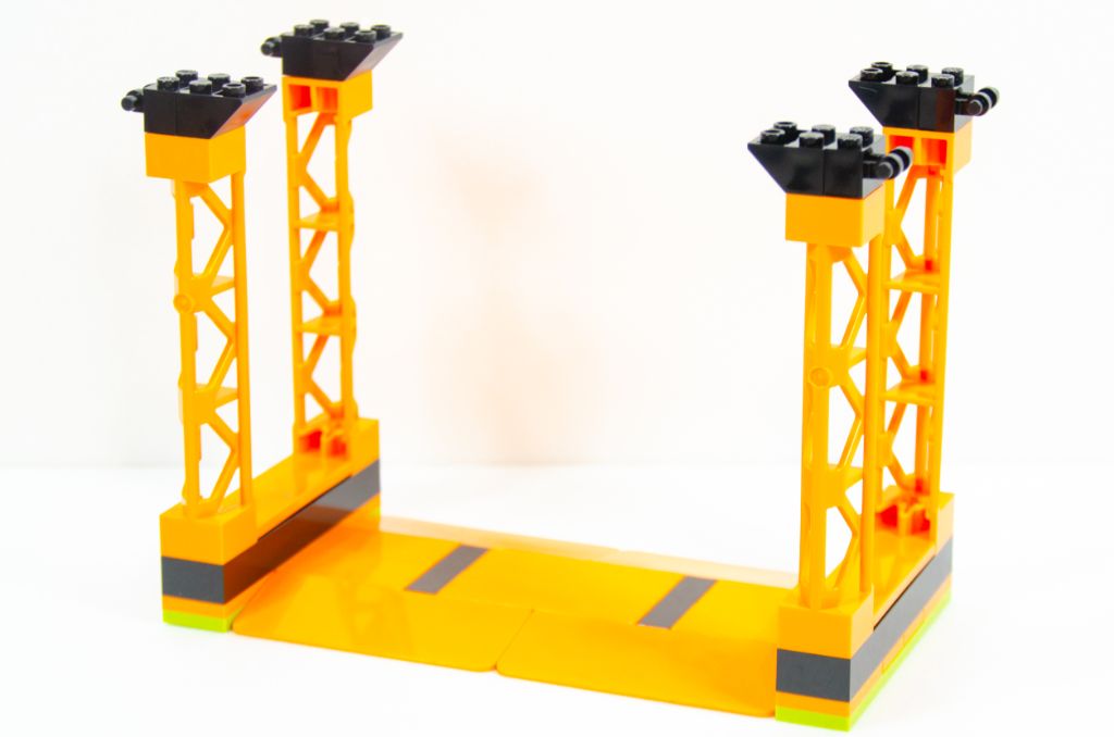 L’assemblage se poursuit par la symétrie de la plaque et nous finissons avec un beau rectangle orange avec des bouts noirs. Tout ça est bien sûr monté très rapidement car à coup de grosses pièces. La hauteur est vite gagnée à l’aide de quatre poteaux creux qui permettent un effet « scène » qui peut rappeler les spectacles de cascades itinérants.