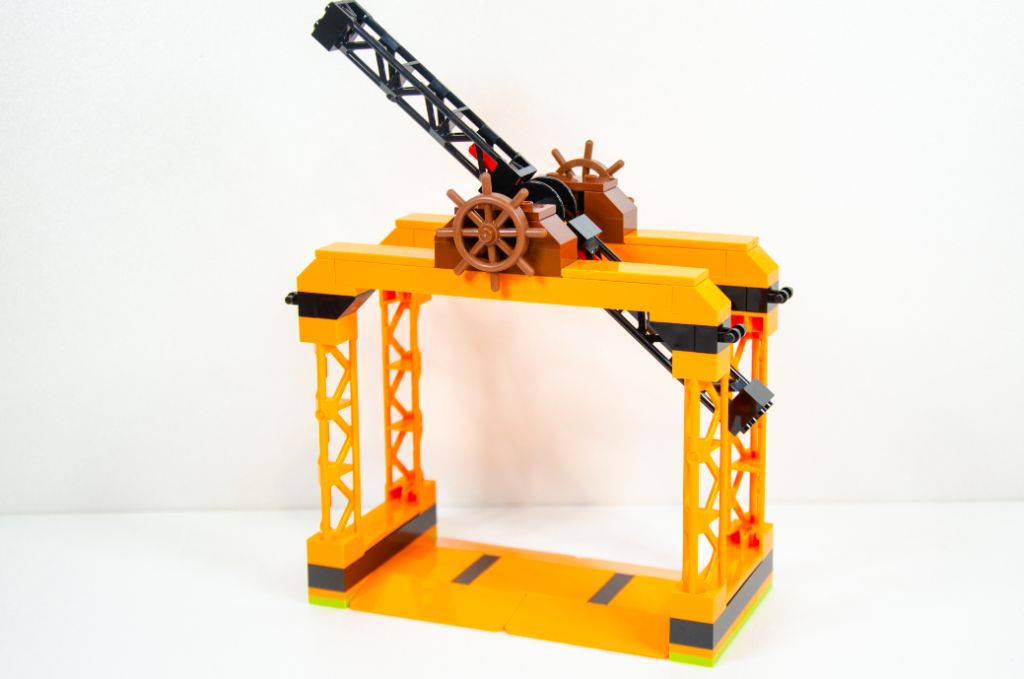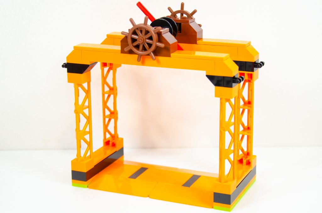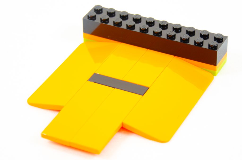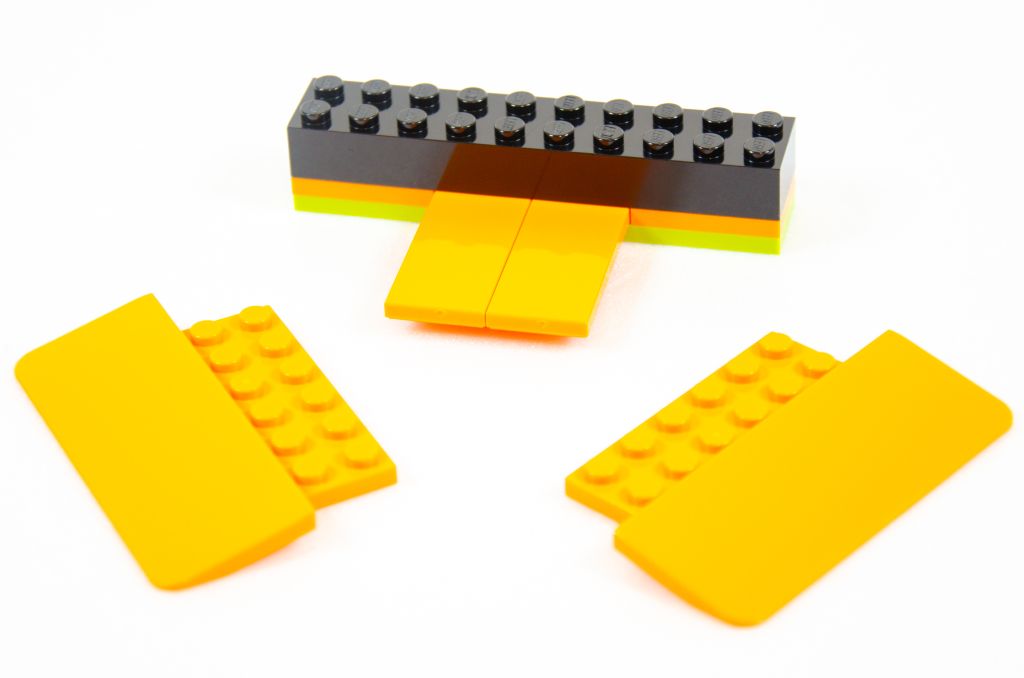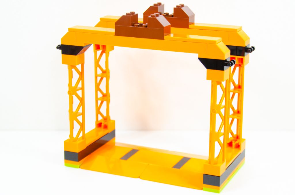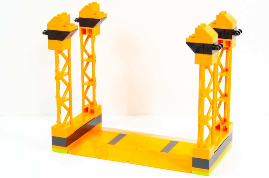 L’assemblage se poursuit par la symétrie de la plaque et nous finissons avec un beau rectangle orange avec des bouts noirs. Tout ça est bien sûr monté très rapidement car à coup de grosses pièces. La hauteur est vite gagnée à l’aide de quatre poteaux creux qui permettent un effet « scène » qui peut rappeler les spectacles de cascades itinérants.