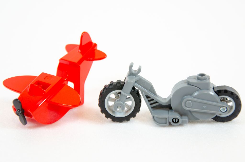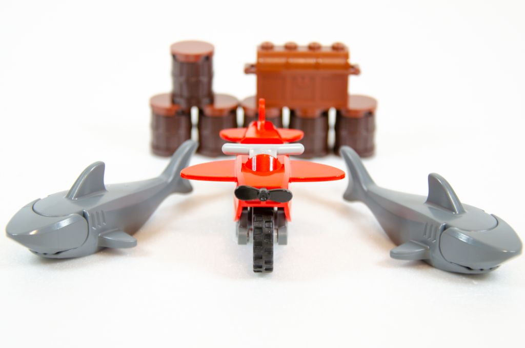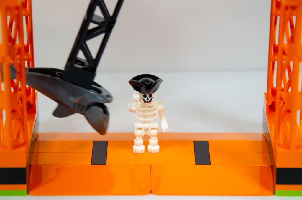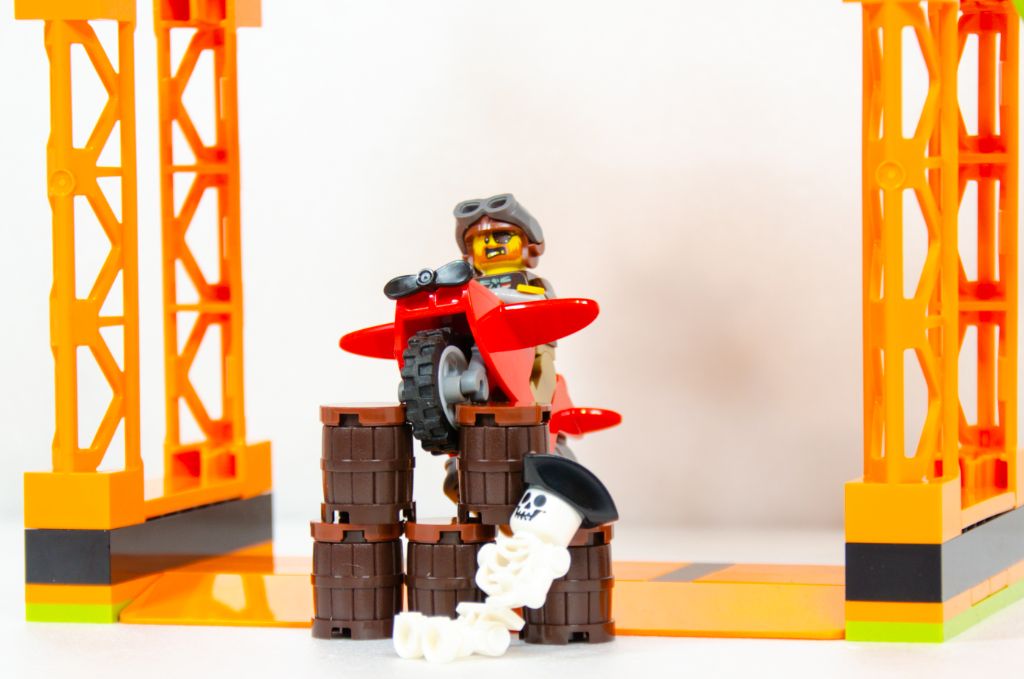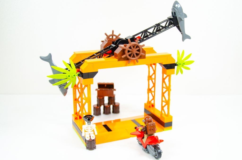 Je pense que les plus jeunes seront contents de pouvoir jouer rapidement avec et s’amuseront à envoyer la moto à travers la roue aux requins et les tonneaux mais que sorti de cette cascade, le set ne propose pas beaucoup plus. La mécano n’est équipée que de sa boîte rouge sans aucun outil à l’horizon pour occuper ses mains. Quant au cascadeur, je trouve ce mélange pirate, motard et pilote plutôt étrange. Il a un sac à dos, un casque d’aviation, une casquette, une carte au trésor mais ne fait que passer à travers la roue aux requins.
