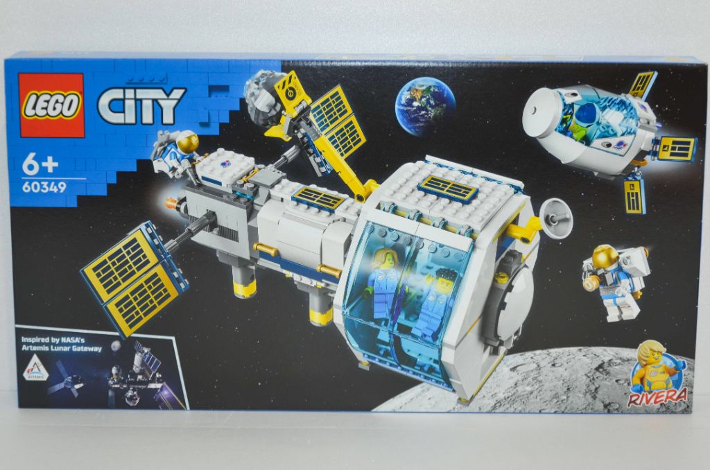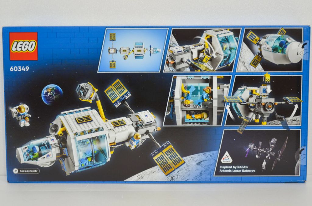 La boîte se présente comme assez grande et très allongée. Elle a les dispositions de la gamme City avec le logo en haut à gauche et un rappel d’un personnage sûrement lié à la série TV (ici Rivera). En bas à gauche, un rappel nous indiquant que le set est inspiré du projet de la NASA, Artemis Lunar Gateway. Enfin en plein centre, la station nous est présentée en apesanteur entourée de nos « legonautes » avec en fond le sol lunaire et la Terre. Je suis étonné de ce grand reflet laissé sur la verrière, je me serais attendu à plus de retouches de la part du marketing.