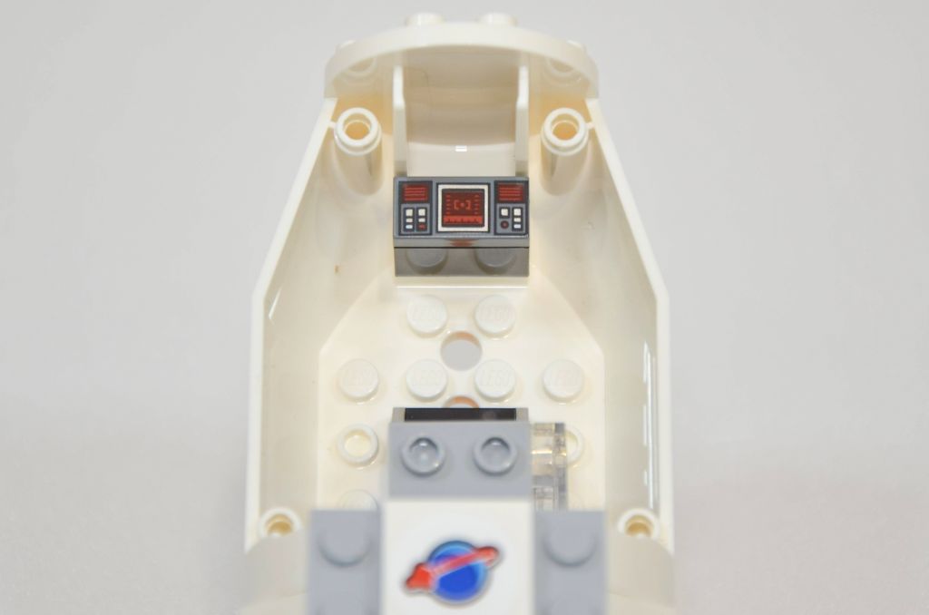 Mise en place de l’intérieur avec une gemme galactique et une console tampographiée qui peut faire parler la nostalgie. La verrière est clipsée et doit donc être complètement démontée pour placer la pilote. Encore quelques autocollants pour décorer cette verrière et c’est fini.