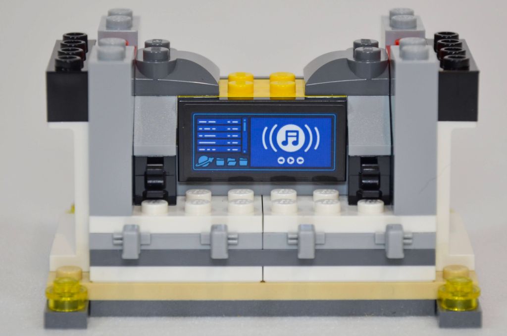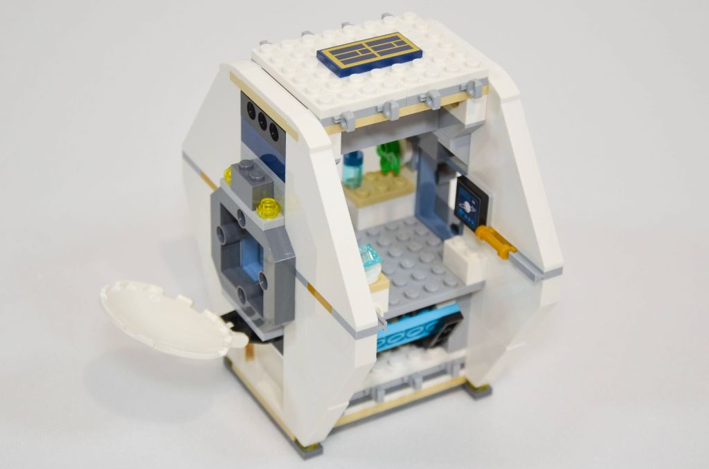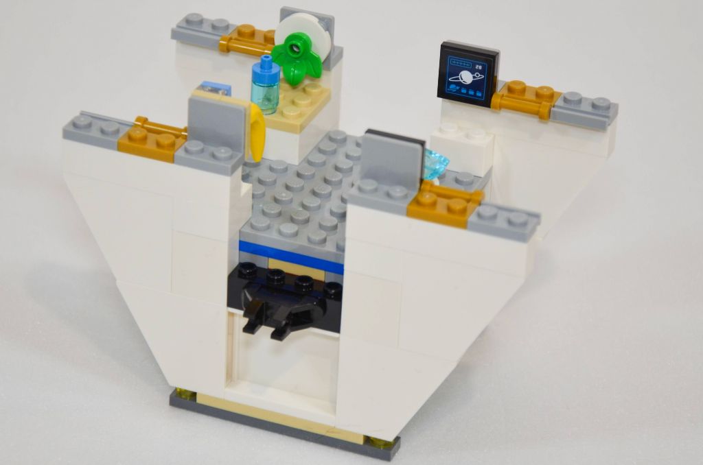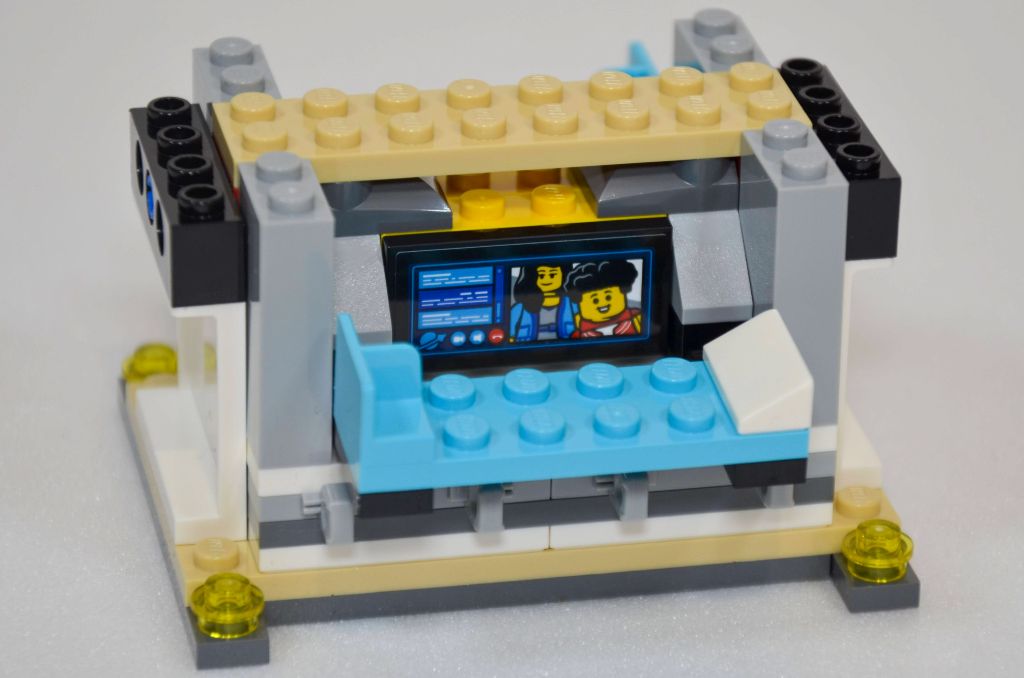 La mise en volume et hauteur se fait avec plusieurs couches de plaques dont celles servant pour les verrières. Les espaces du bas accueillent les deux couchettes (pour 5 minifigs) et deux autocollants agrémentent les écrans. J’aime particulièrement celui de la famille. Les « chambres » sont assez spartiates.