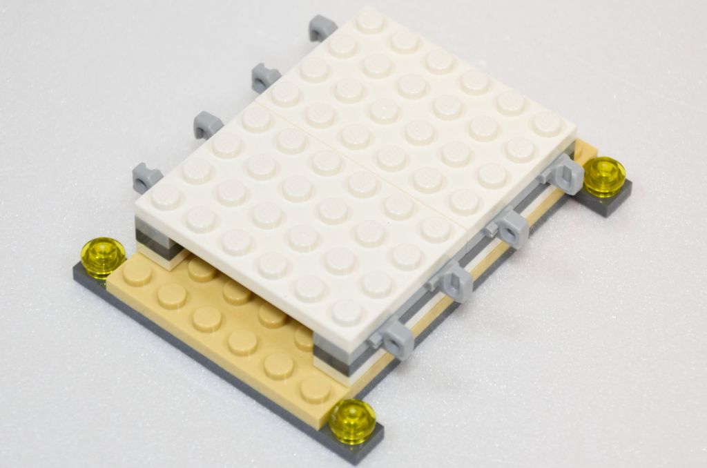 La mise en volume et hauteur se fait avec plusieurs couches de plaques dont celles servant pour les verrières. Les espaces du bas accueillent les deux couchettes (pour 5 minifigs) et deux autocollants agrémentent les écrans. J’aime particulièrement celui de la famille. Les « chambres » sont assez spartiates.