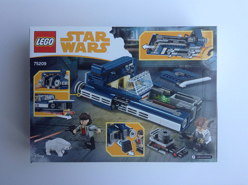 La face avant du set montre le Landspeeder en virage sur un quai, tirant des traits rouges. Han Solo est aux commandes : il pilote d’une main et tire avec un pistolet de l’autre, vraisemblablement sur le Corellian Hound qui s’approche de manière menaçante du véhicule. A ses côtés, sur la banquette de droite, Qi’ Ra, un des personnages de Solo: A Star Wars Story. Dans le fond, on aperçoit un plan d’eau, des structures métalliques ainsi que des trainées de tirs accompagnées d’explosions : le couple est poursuivi ! Le dos de la boîte met en avant les fonctionnalités du Landspeeder que nous détaillerons plus loin.
