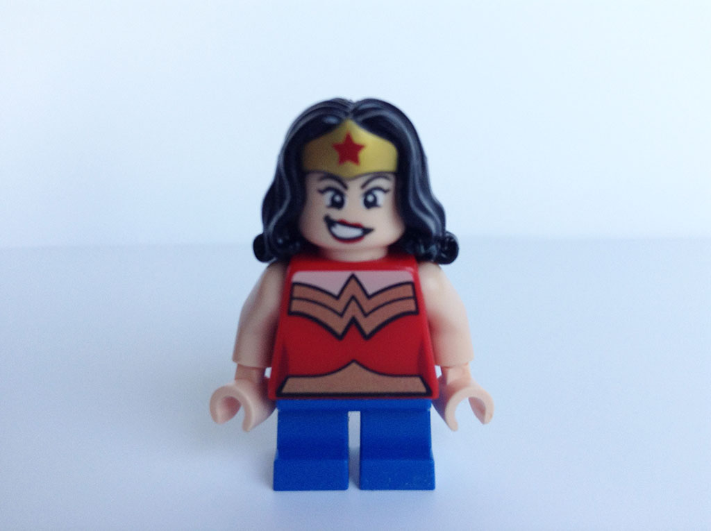 A laquelle ces deux actrices qui ont incarné Wonder Woman à l’écran, à 40 ans d’intervalle, la minifig ressemble-t-elle le plus ? Difficile à dire. Toujours est-il qu’elle est réussie. L’œil détecte immédiatement les éléments caractéristiques de la princesse Diana, alias Wonder Woman : le haut du costume à dominante rouge et or, le short bleu, ainsi que la longue chevelure noire. Les bras arborent une couleur chair, ce qui est cohérent. Au niveau la taille, deux traits dans un rouge plus prononcé donnent une subtile illusion de plis sur le vêtement. La ceinture, le symbole de l’aigle à hauteur de poitrine ainsi que le diadème intégré à la chevelure de l’héroïne, sont tous tampographiés.