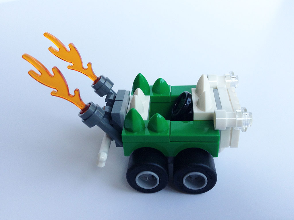 Le véhicule de Doomsday, tout en pointes et en flammes, est à l’image du personnage qui le pilote : extravagant et aggressif. Sa construction suit la même logique que celle de l’avion. Ses couleurs, à base de vert, blanc, et gris se combinent avec bonheur, tout en faisant écho à celles de la minifig.