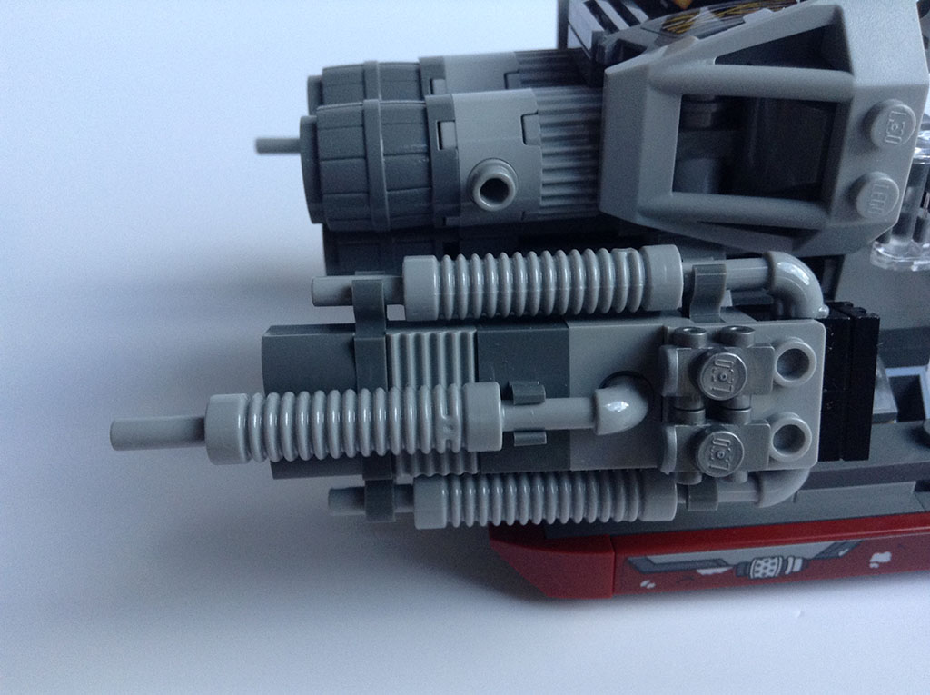 A partir de là tout va très vite : on monte l’imposant bloc moteur, on fixe les trois réacteurs principaux à l’arrière, ainsi que les tuyères à poussée vectorielle sur les côtés. Et l’on termine par le cockpit en forme de bulle transparente et quelques enjolivements (Fig. 7).