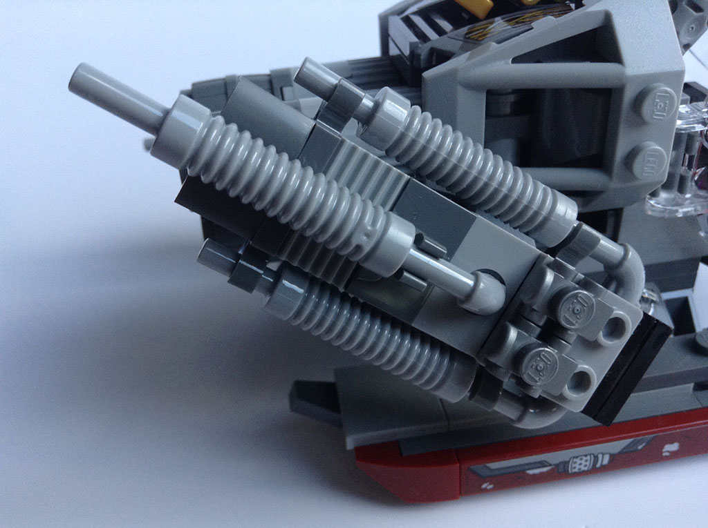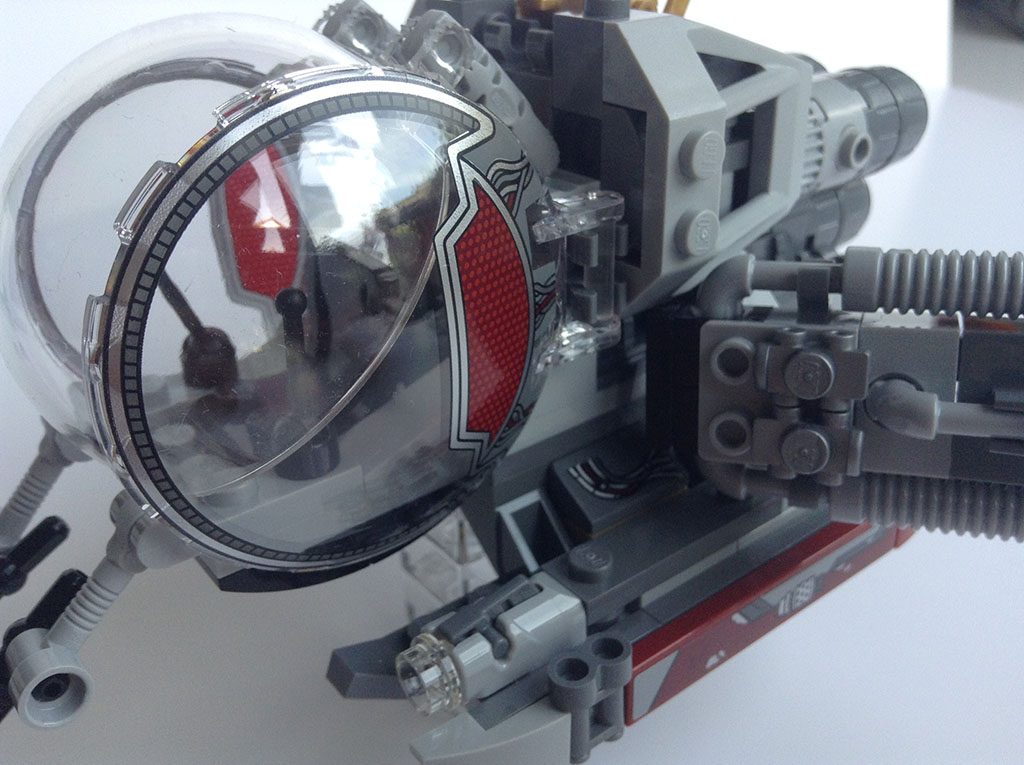 Le design évoque une espèce d’insecte technologique à piloter. Une monture parfaite pour Antman. On regrettera juste le choix décalé du jaune-or pour les deux pièces au sommet du vaisseau, ainsi que la dureté du mécanisme pour relever la demi-sphère du cockpit.