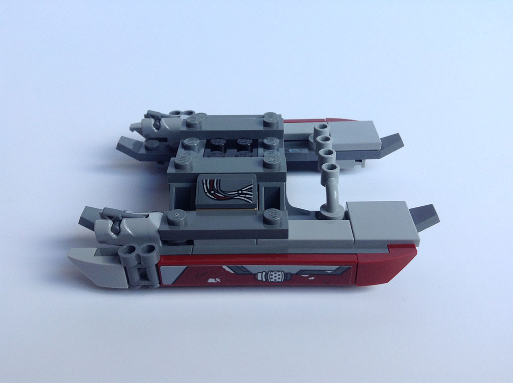 Voilà comment nous pourrions définir le véhicule quantique du Docteur Pym ! Sa construction débute par un socle (Fig. 5) dont la pièce maîtresse est un Dark Bluish Gray Helicopter Sled Rails 12 x 6. En clair : des patins d’atterrissage d’hélicoptère. Grâce à des techniques SNOT, on va ensuite donner du volume à ces patins, sur les côtés, et ils vont quelque peu prendre l’apparence de flotteurs ! Ce socle accueille en toute logique la cabine de pilotage de laquelle sortent deux bras articulés, sorte de mandibules d’insecte (Fig. 6).