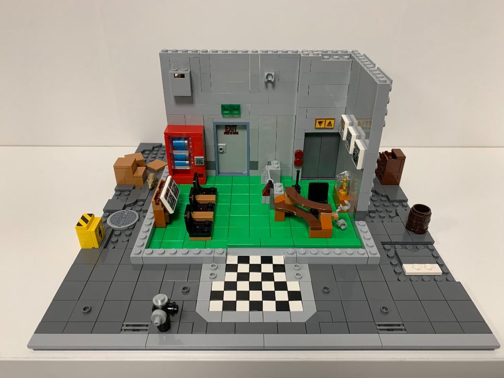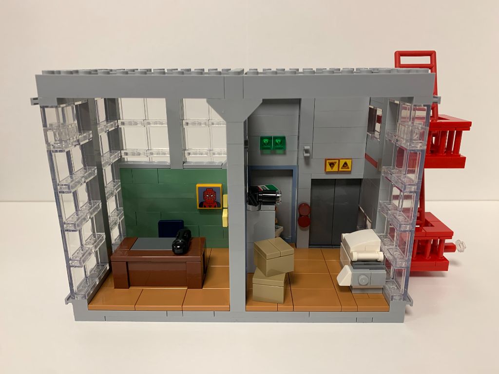 L’intérieur est très détaillé avec des bureaux aux designs différents et tout plein d’accessoires intéressants. La conception du faux ascenseur prend des libertés sur la continuité verticale mais ce n’est pas bien méchant.
