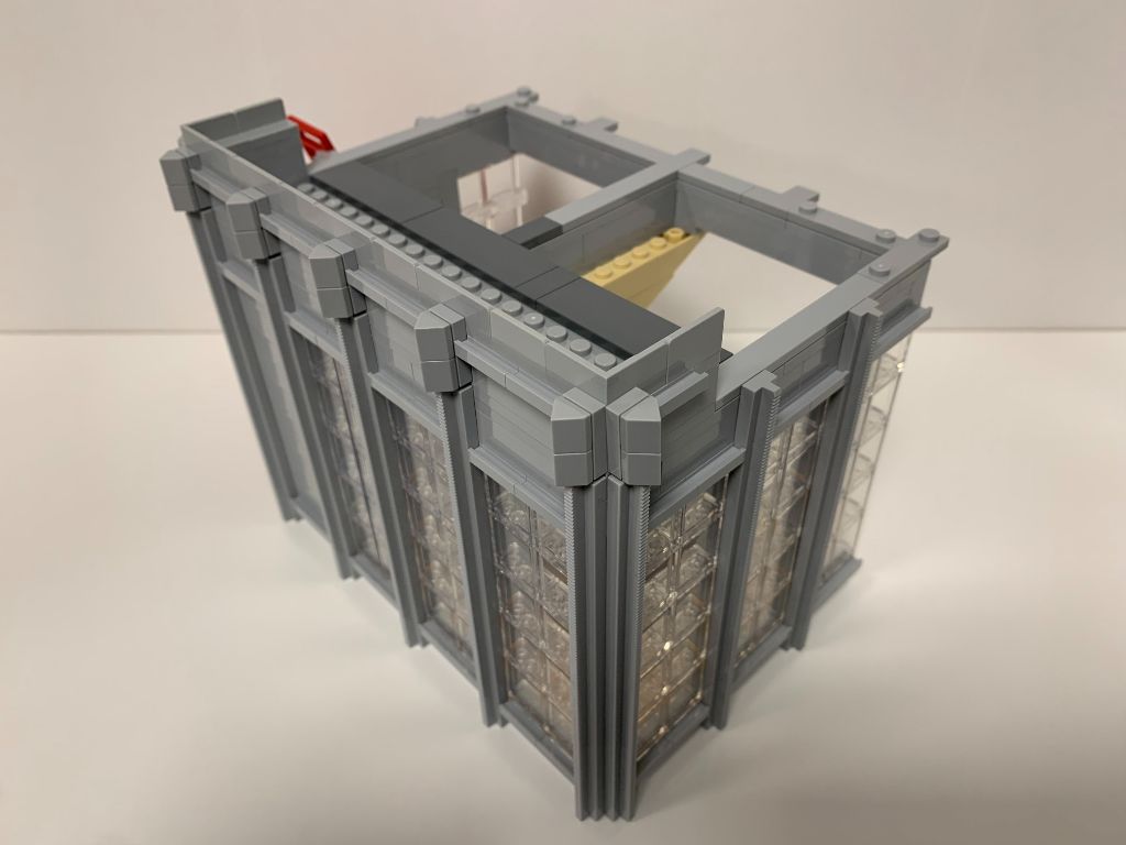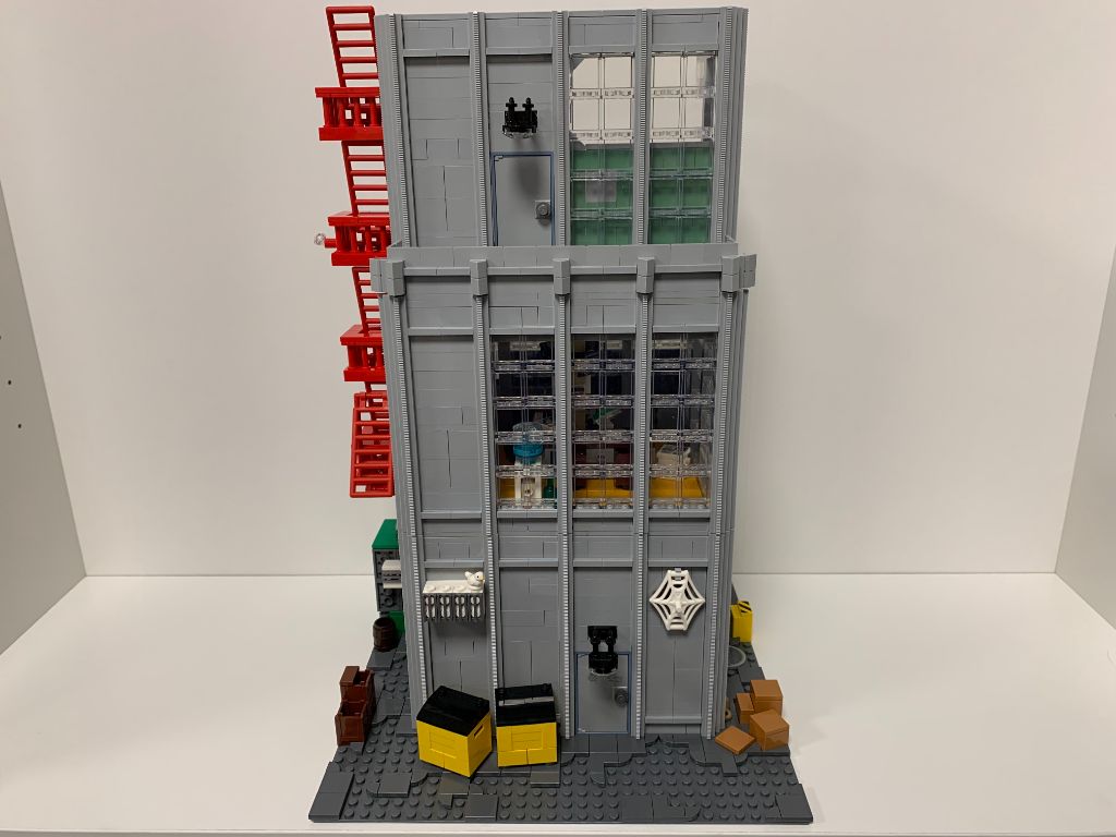 On construit le morceau de mur qui vient boucher le trou béant sur le côté de l’immeuble (qui a malheureusement tendance à sortir tout seul de son encoche lorsque l’on manipule le set) et on pose à la verticale les longues pièces de type rail pour finir la façade.