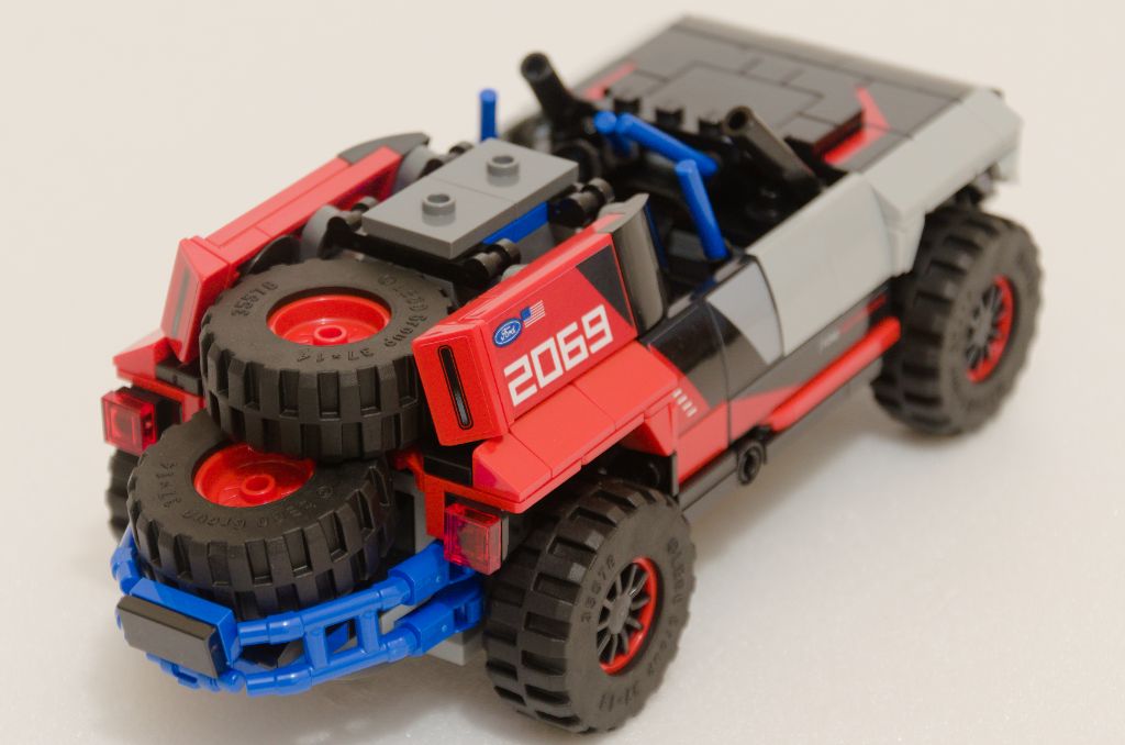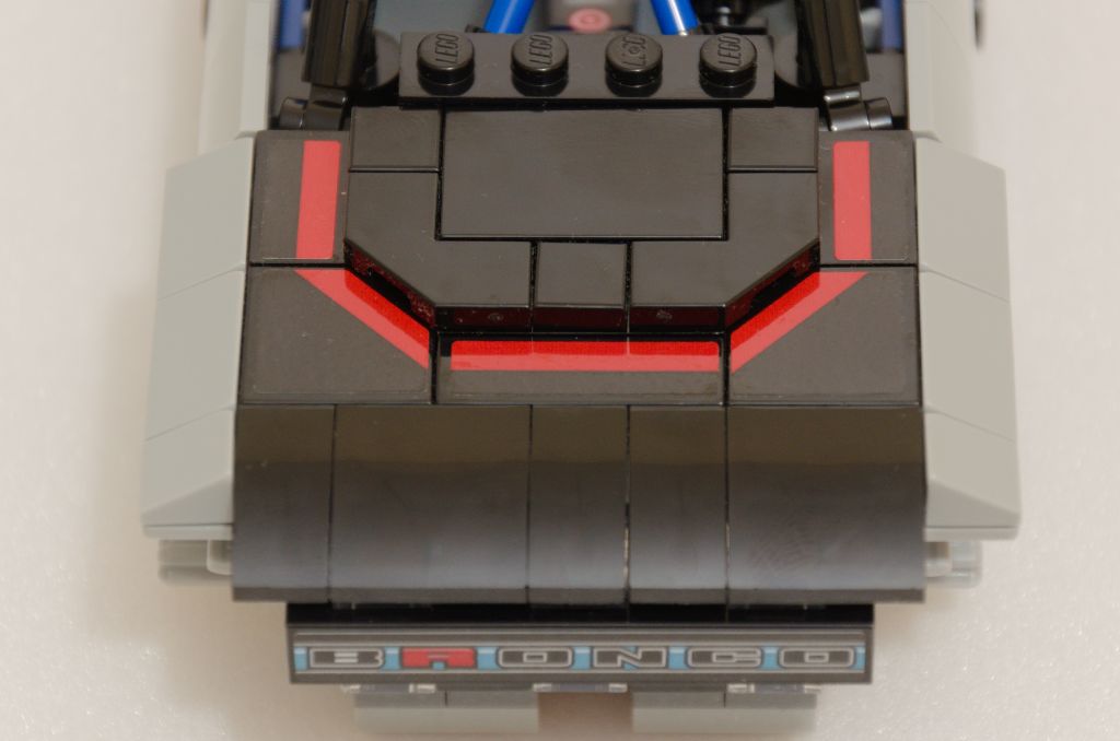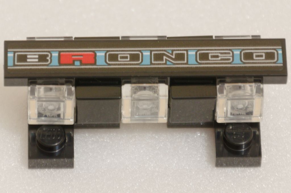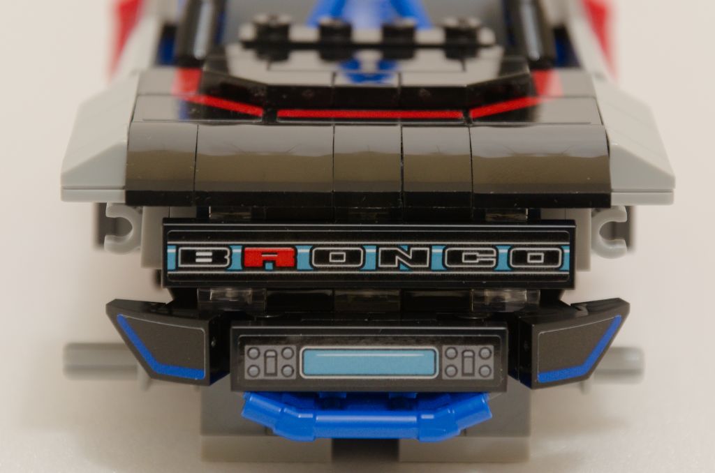 Retour sur la partie supérieure avec la création des sièges et de la partie arrière du Bronco. Tout ça continue à avoir son côté massif et solide. La calandre est faite par un sous-ensemble qui contient les feux en brick built et un autocollant Bronco décore le tout.