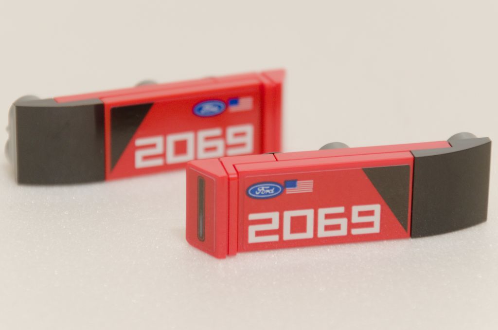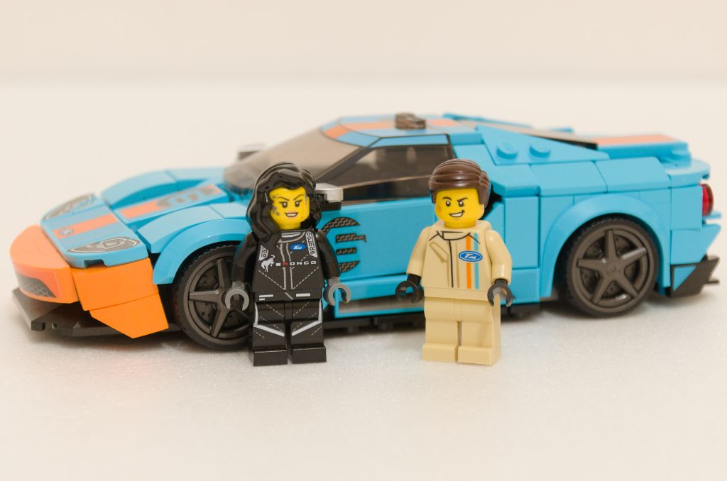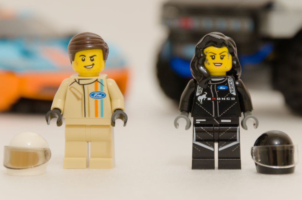 LEGO fournissant deux véhicules, logiquement et heureusement deux minifigs sont aussi livrées, une femme pour le Bronco et un homme pour la GT. La femme reçoit une très belle combinaison noire du torse aux jambes avec une finition soignée. Le livret laisse supposer que les traits devraient être blancs mais ils apparaissent un peu ternes mais ça n’est pas choquant. Il est aussi appréciable de voir le bronco et les sponsors bien visibles.